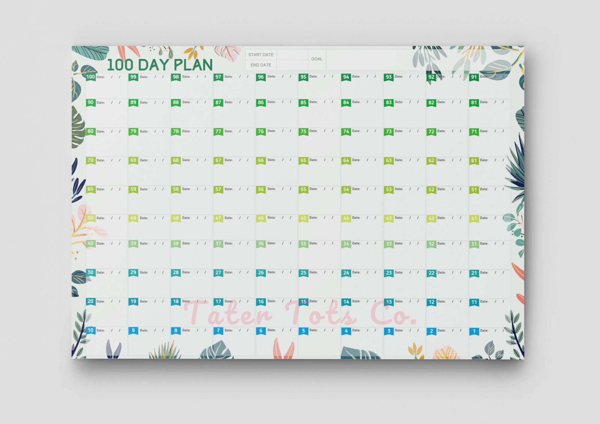 100 Day Challenge Planner: Tropical Leaf Habit Tracker (Instant Download PDF)