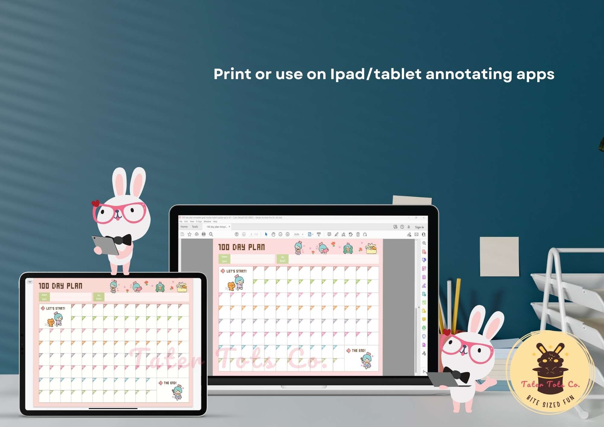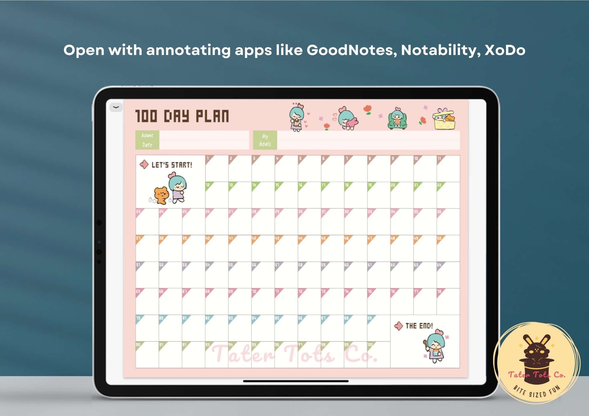 Looking to tackle a big goal or project? Take up the 100 Days Challenge! With this 100-day "game plan" template featuring a cute hand-drawn chibi little girl with her bunny and bear to help you stay motivated, you can break down your goal into smaller, manageable steps and stay accountable for 100 days straight.