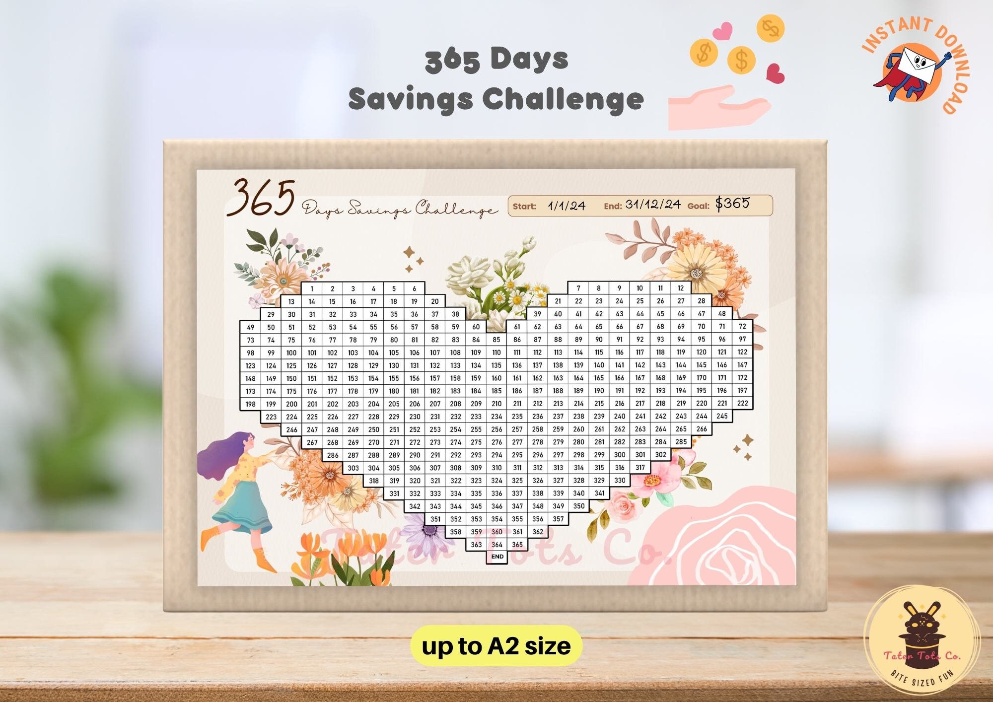 • 365 Days Savings Challenge Floral Heart Pixel Art Coloring Page up to A2 size