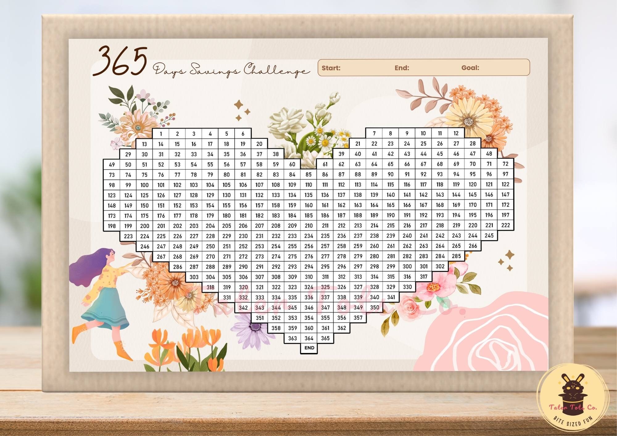 365 Day Savings Challenge: Floral Heart Pixel Art Tracker (PDF)
