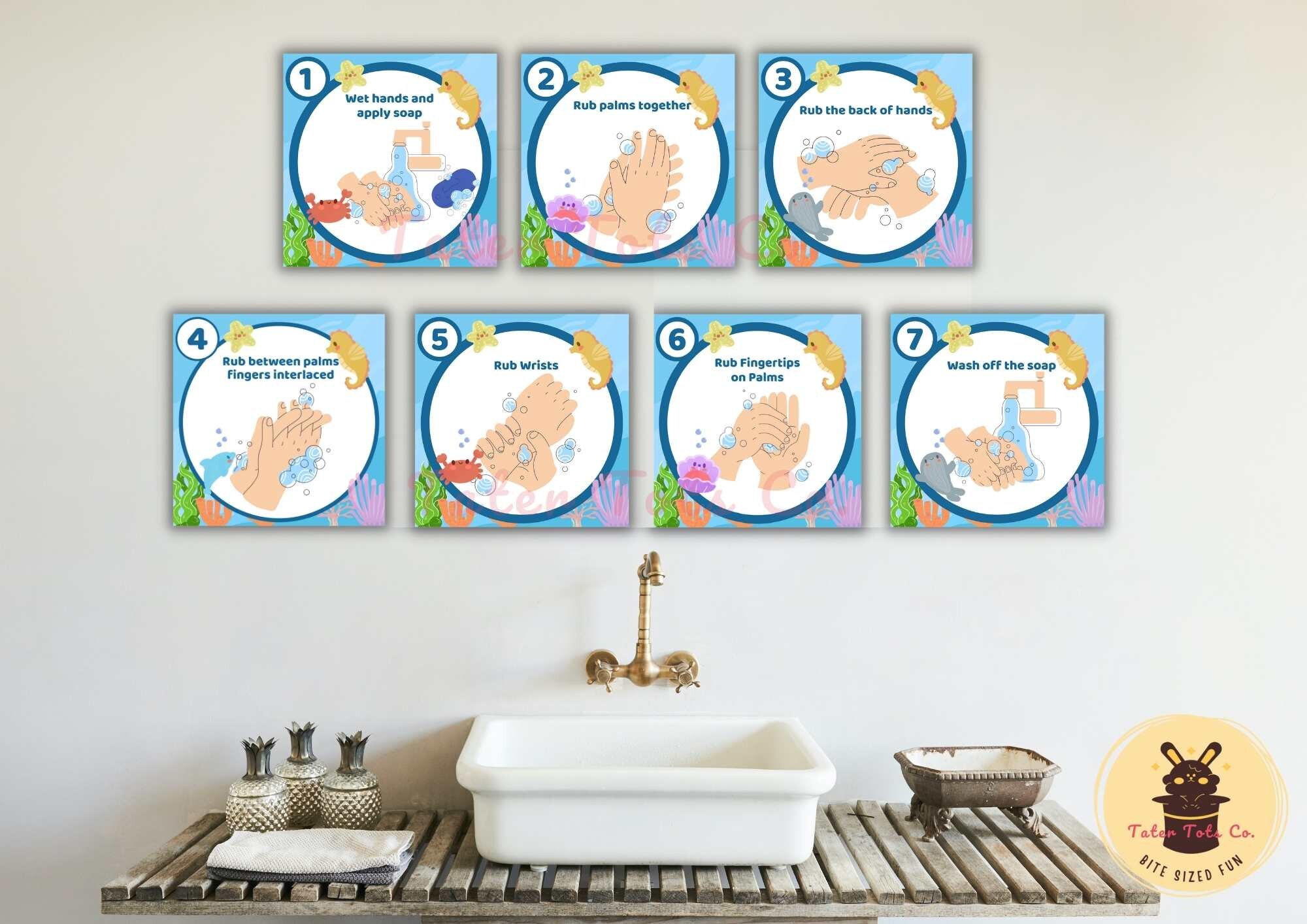 7 Step Wash hands sign for Preschool Toilet Training and Instructions Sea Creatures Theme Instant Download (PDF)