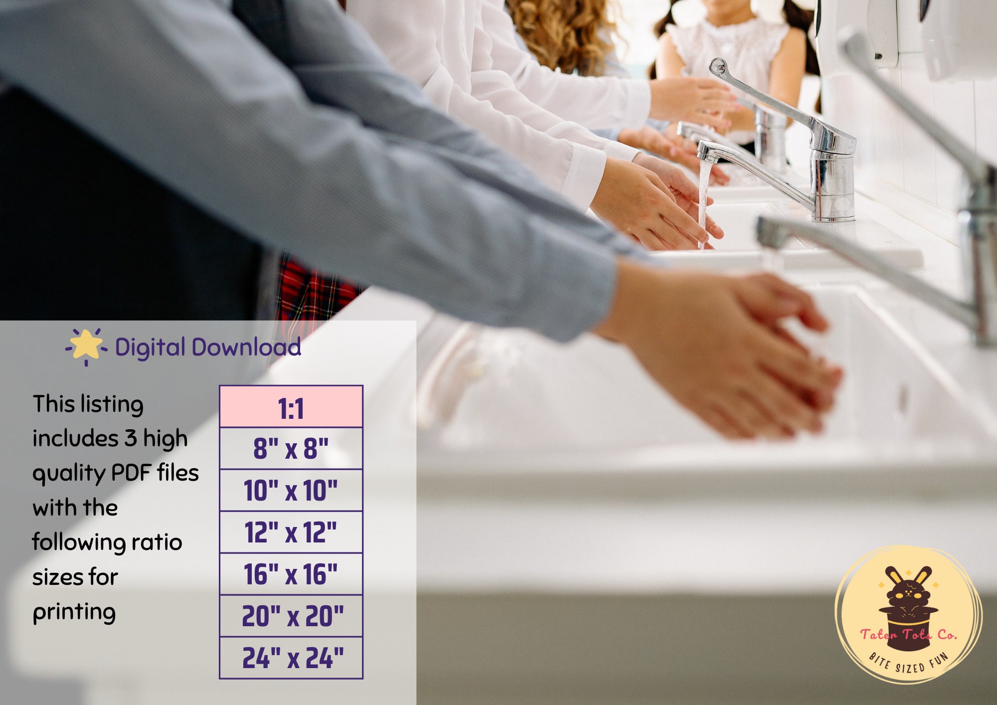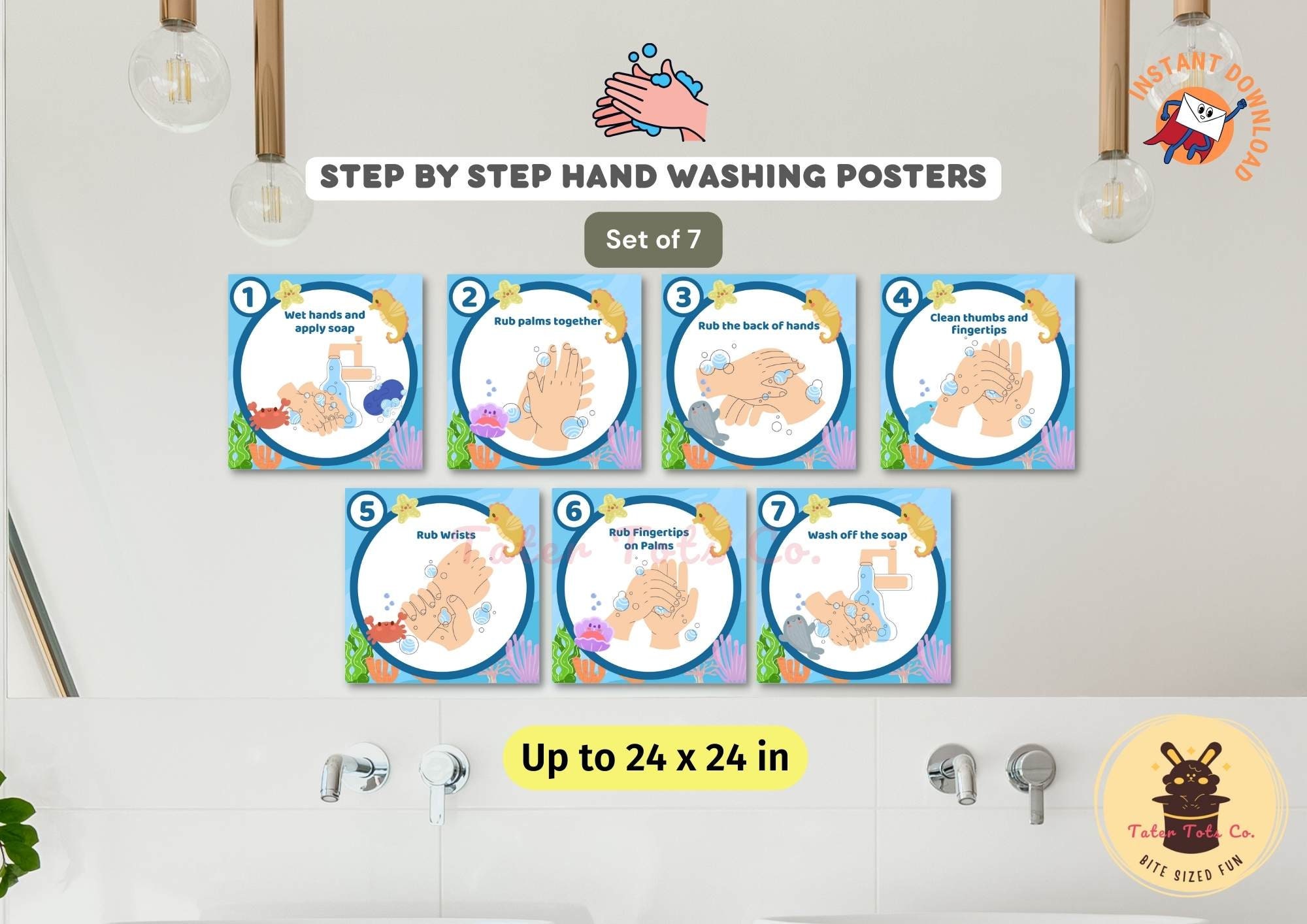 • 7 Step Hand washing posters for kids up to 24x24in (4 PDF files)