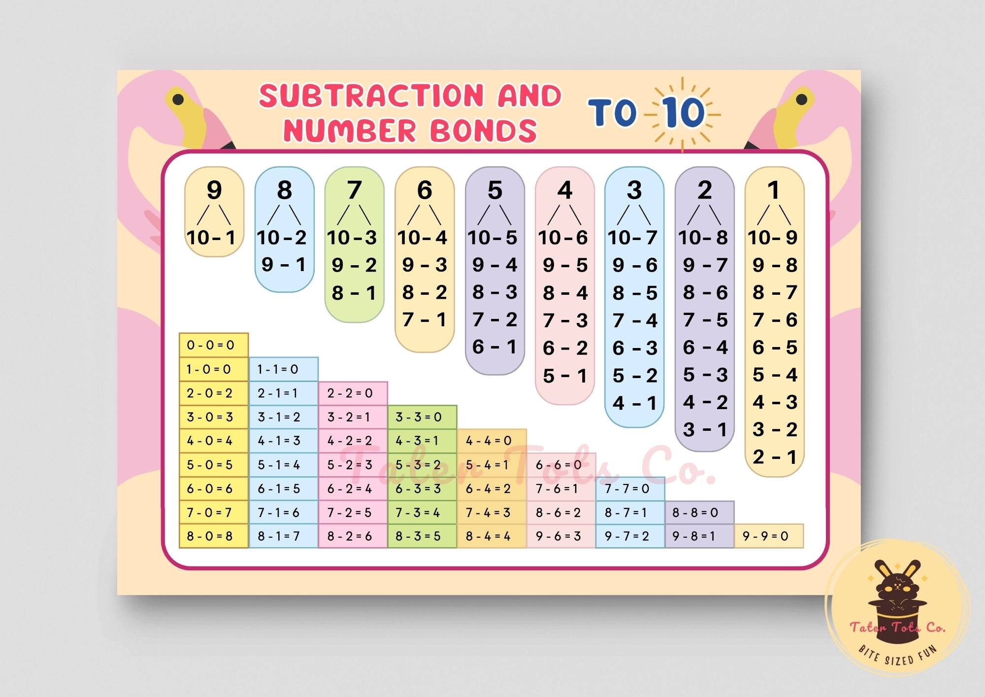 Addition and Subtraction Number Bonds to 10 Math Charts Giraffe Flamingo Set of 2 Flashcards Instant Download PDF