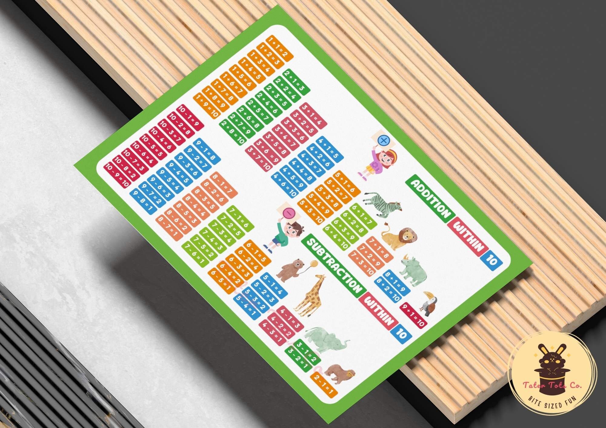 Enhance early math skills with our Math Number Chart Poster, instantly downloadable in PDF format. This educational resource is designed for preschool to 1st-grade students and introduces addition and subtraction within 10.