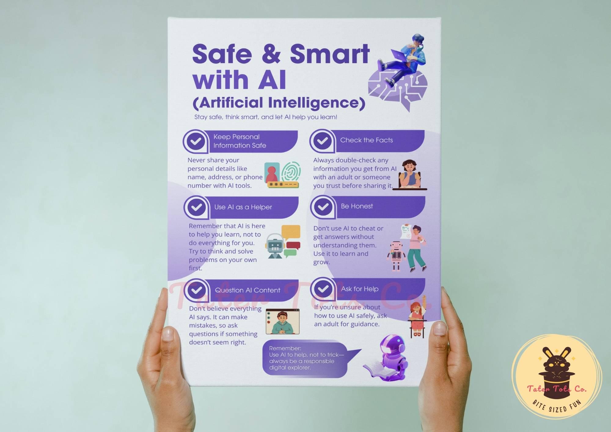 Download this engaging and colorful printable infographic, "Safe & Smart with AI," as an instant PDF—ideal for students!