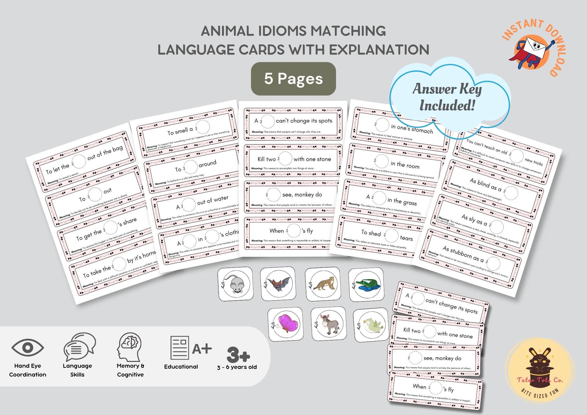 Enhance language skills while having fun with our Animal Idioms Matching Language Cards game! This engaging printable activity is specifically designed for kindergarten and preschool children. With this PDF instant download, you can easily print the game and start teaching common idioms used in daily conversations.