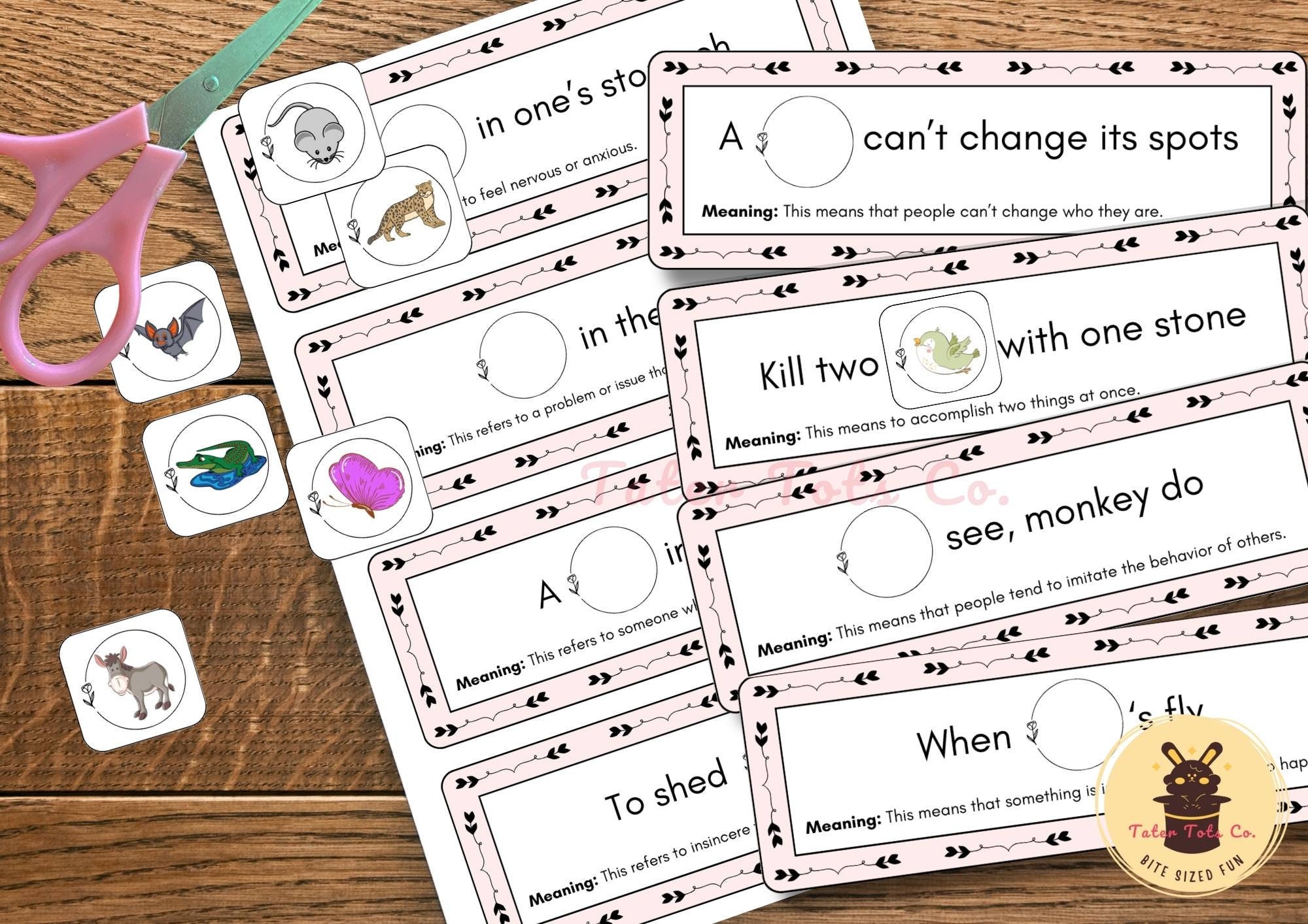 Print on A4 (8.3 x 11.7 in) paper, laminate, and apply velcro stickers onto animal cards. You can choose to cut out each idiom card or leave it as it is for the matching activity.