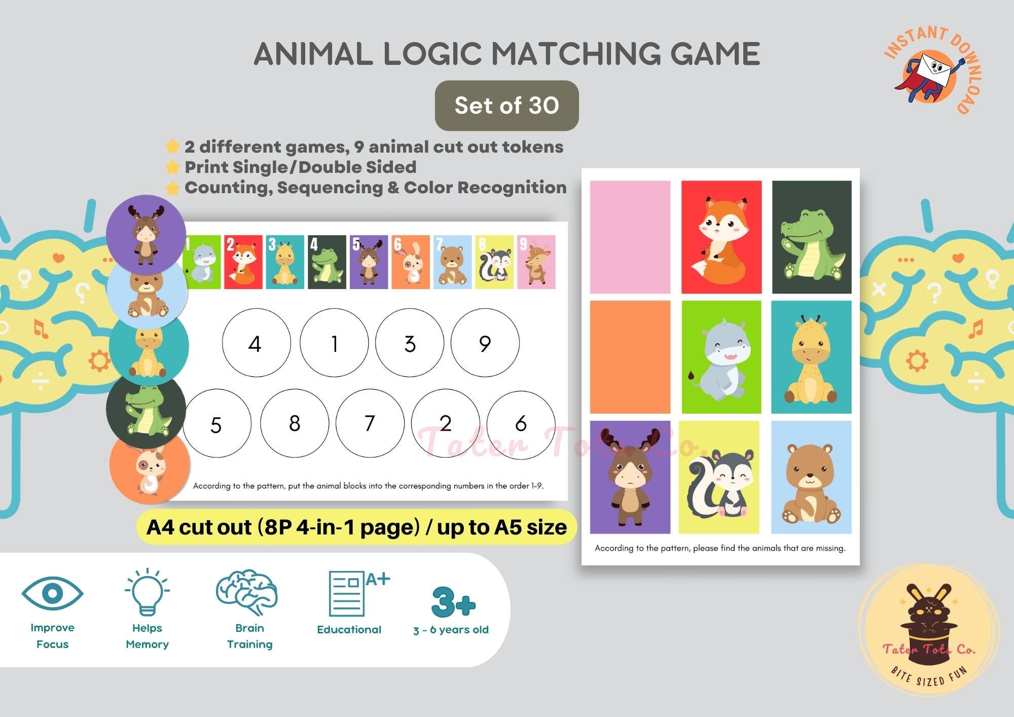 Animal Logic Matching Game: Preschool Number Sequencing Puzzle (Digital Download)