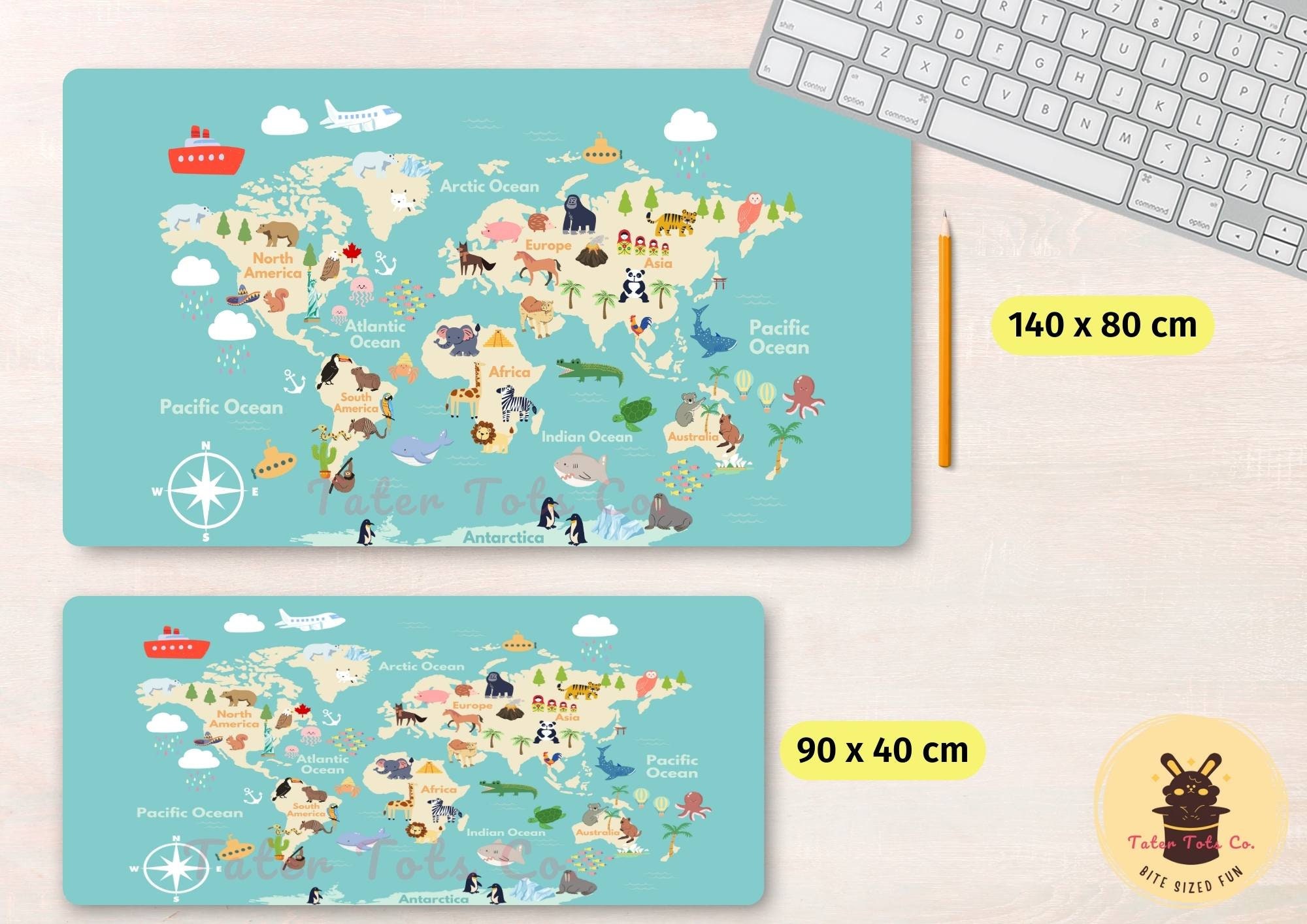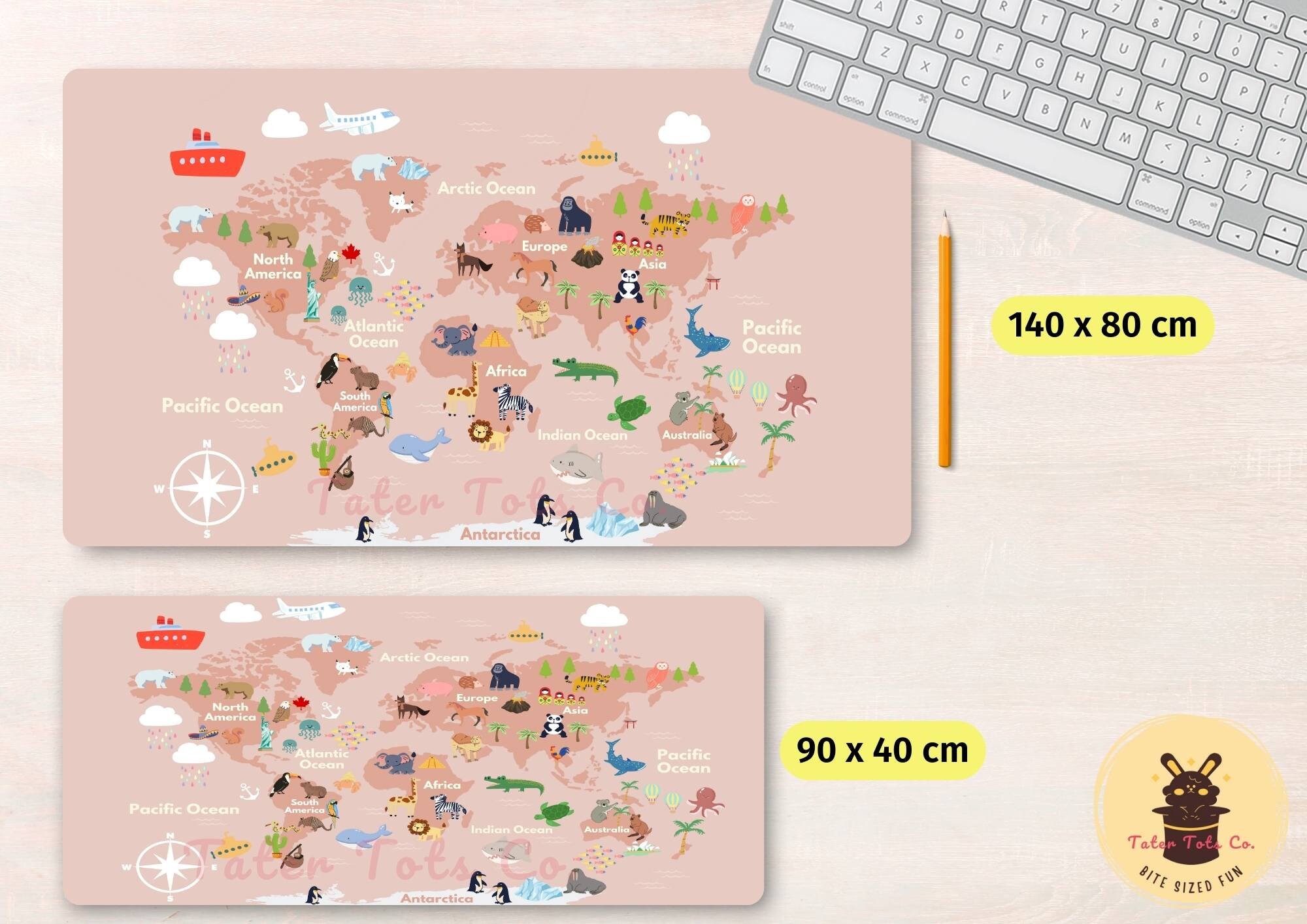• Animal World Map for Kids Custom desk mat table/desk mat Sublimation design (Choose from Turquoise Blue or Blush Pink)