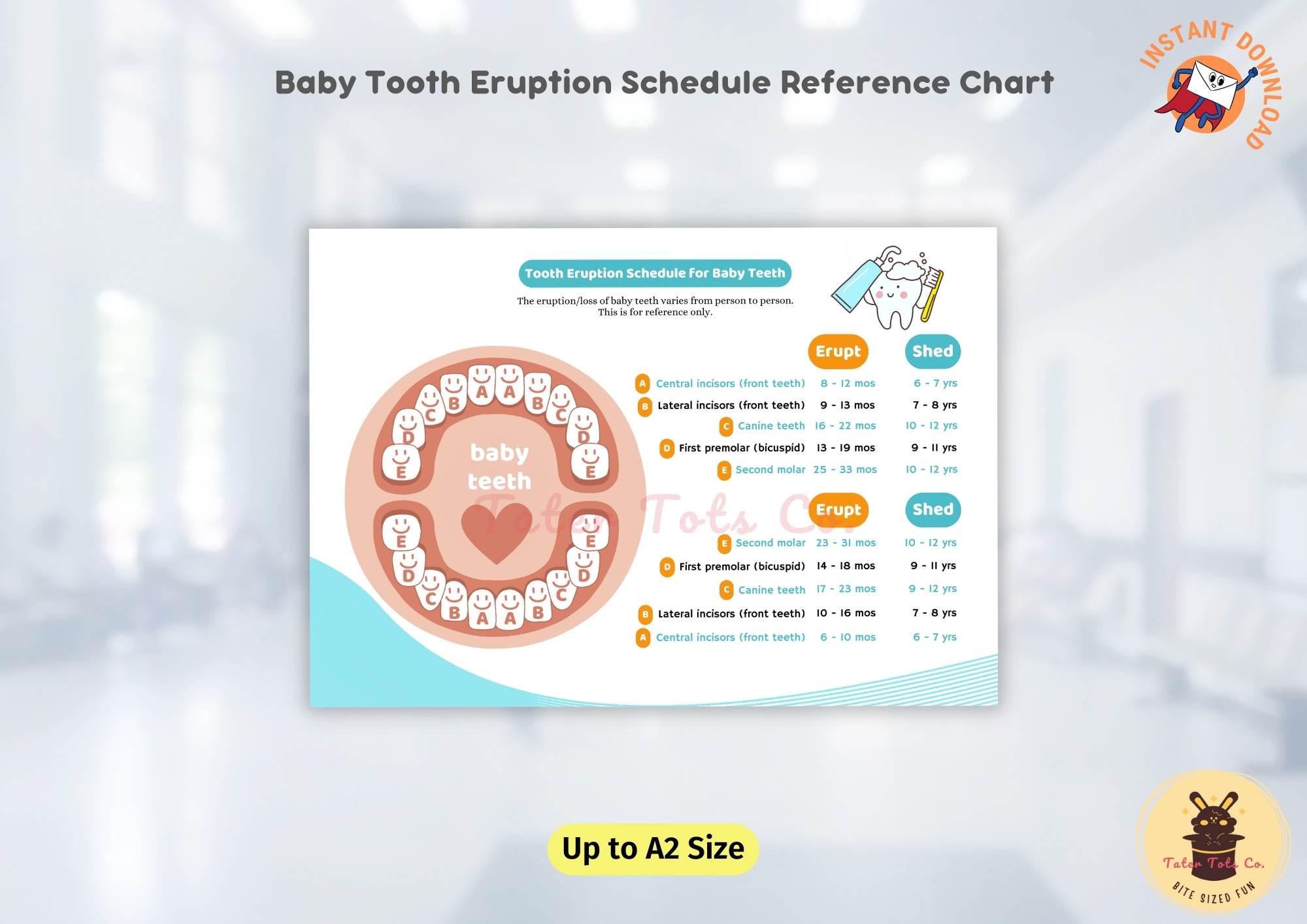 • Baby Tooth Eruption and Shedding Teeth Schedule, Replacement Reference Diagram (Landscape) up to A2 size