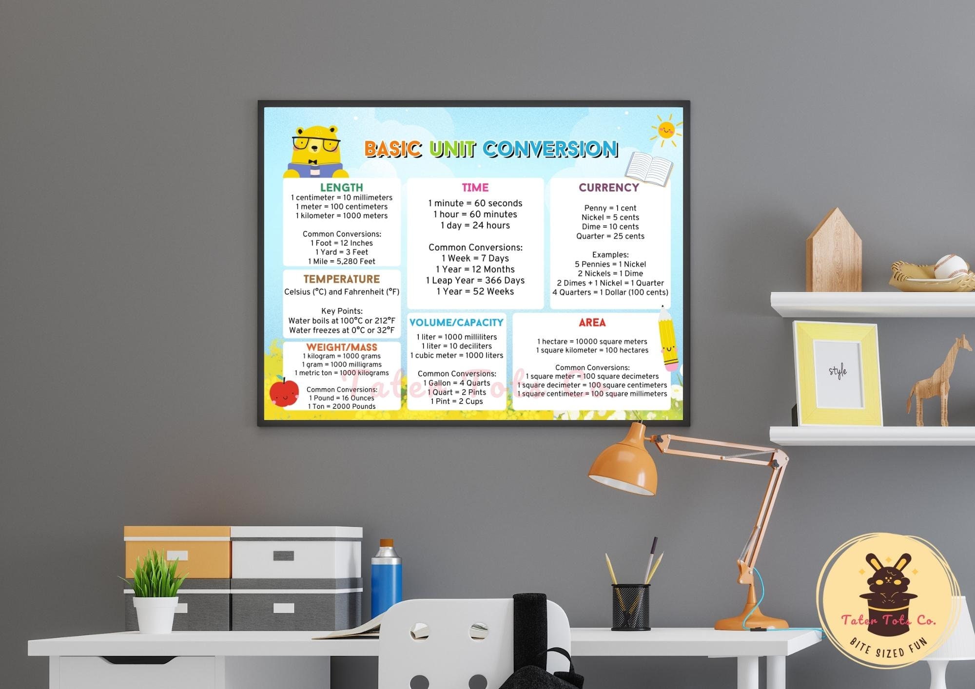 Our chart covers a wide range of common units, including length, volume, weight, area, time, temperature, and currency. Each section is designed with clarity and simplicity in mind, making it an invaluable resource for math beginners. The vibrant design ensures engagement and easy readability for young learners.
