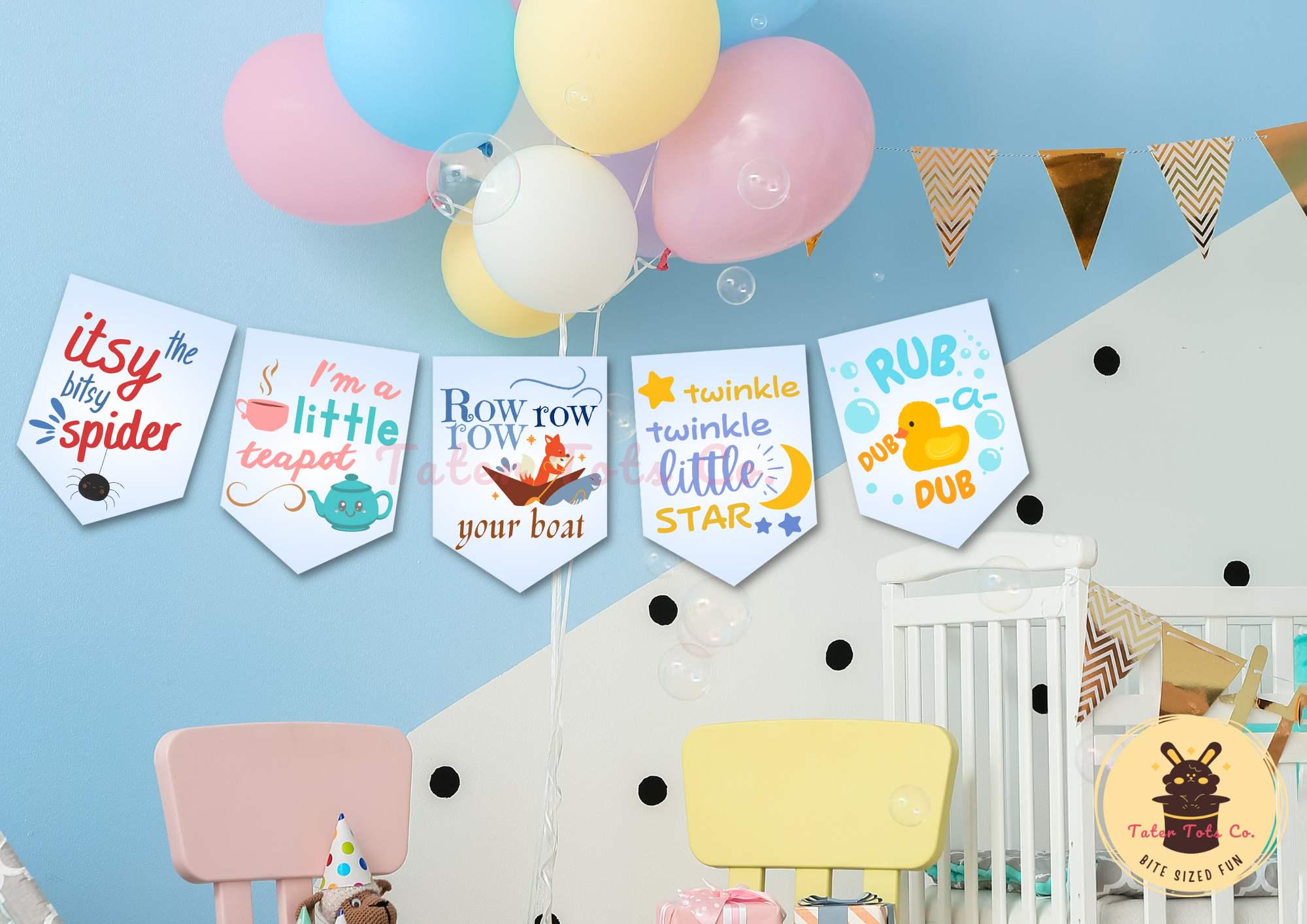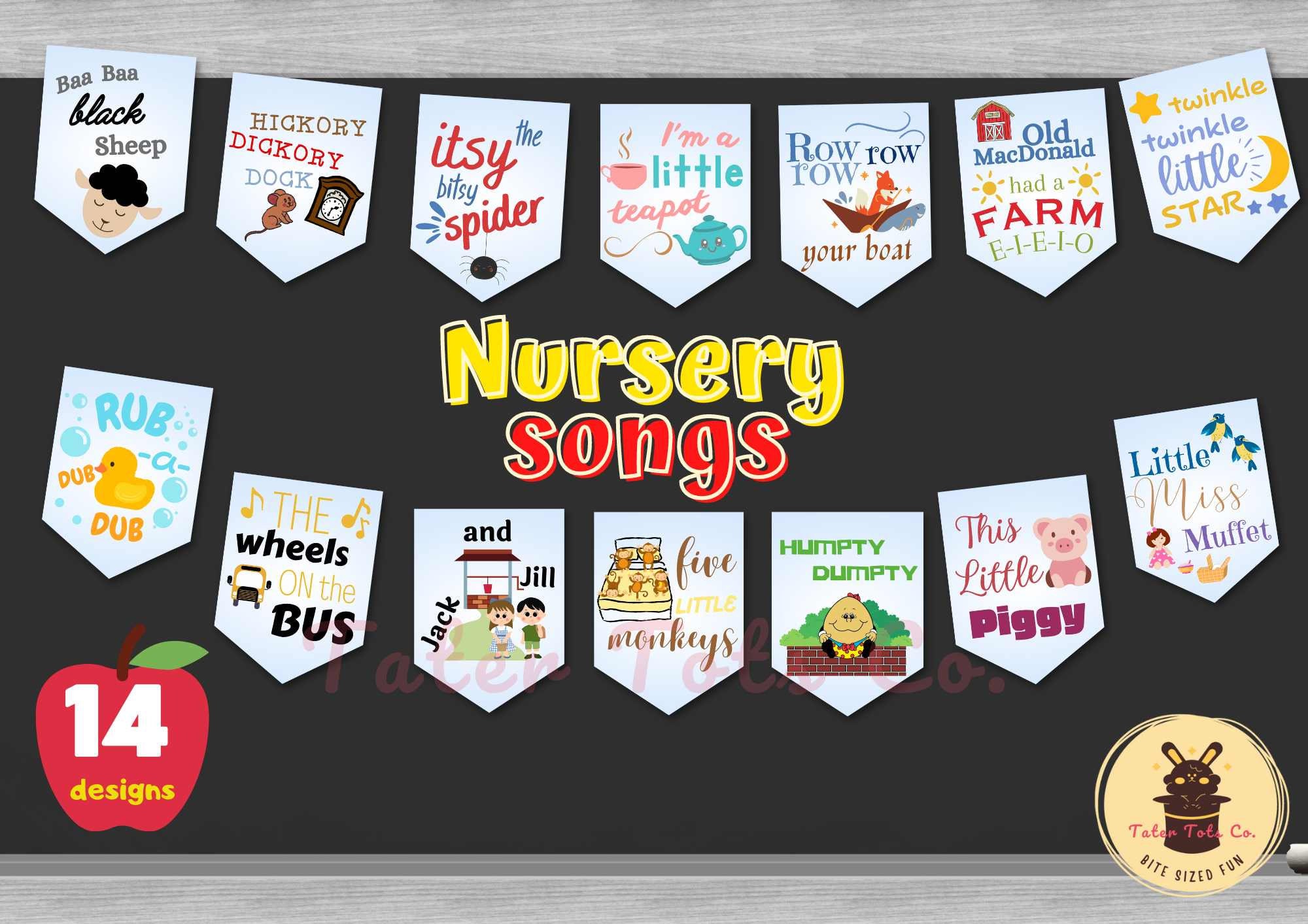 Transform your preschool classroom or baby room/shower backdrop into a vibrant and engaging space with our Nursery Rhymes and Song Title Theme Bunting. Instantly download and print this eye-catching and educational decor that will captivate children's attention while promoting learning and creativity.