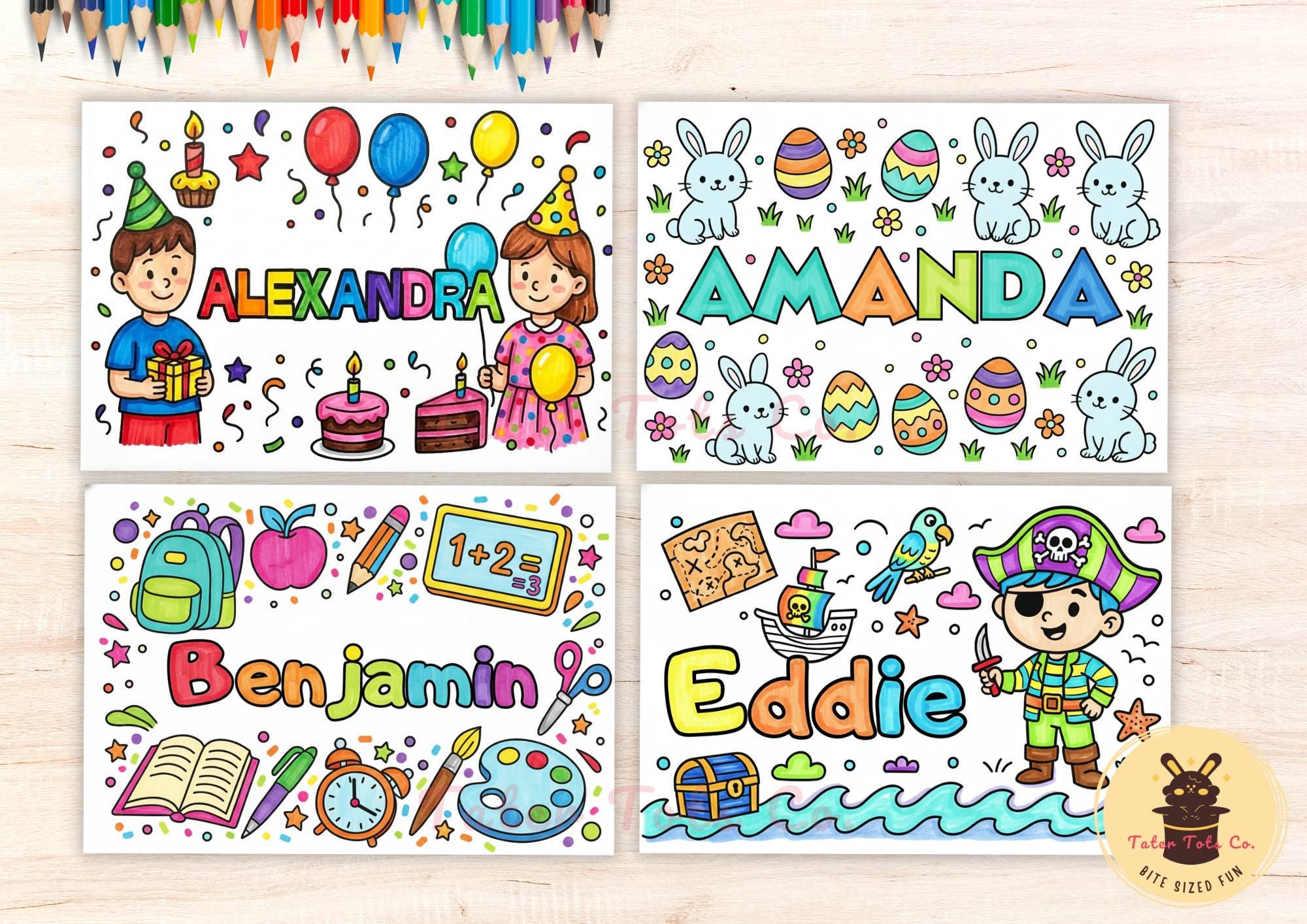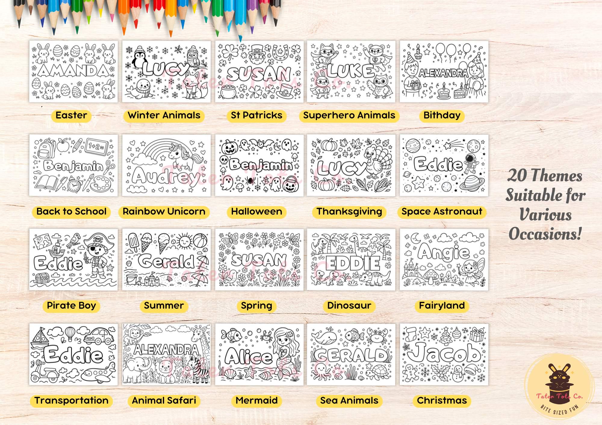 Custom Kids Name Coloring Pages 20 pages Fun Themed Canva Template Bundle for Personalization