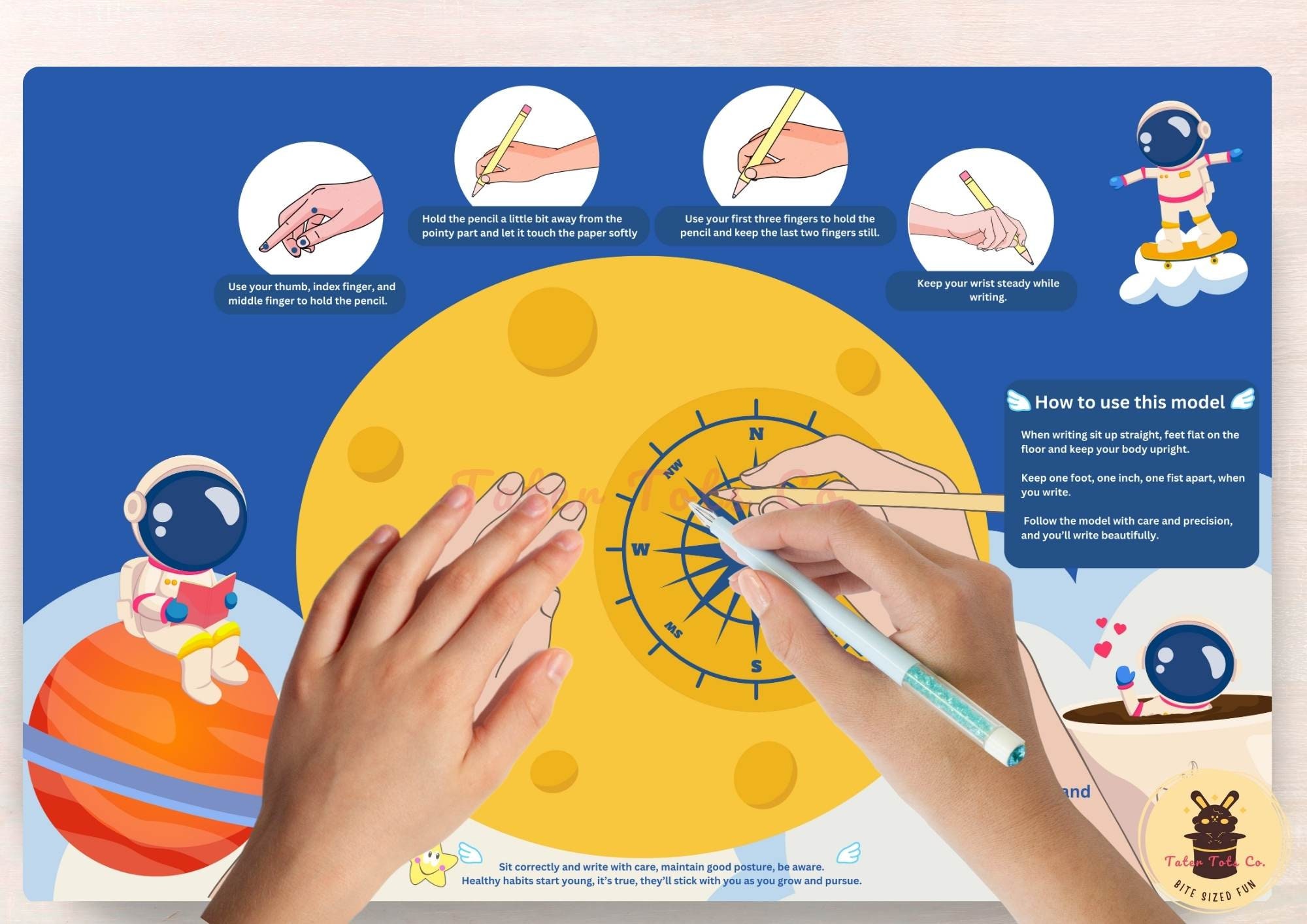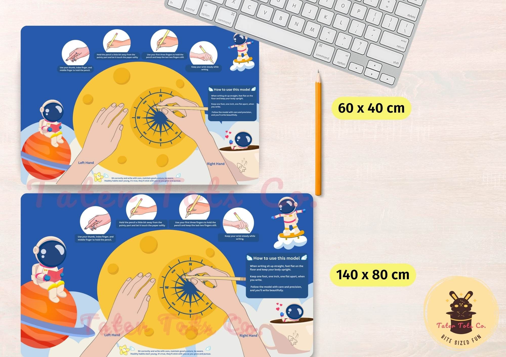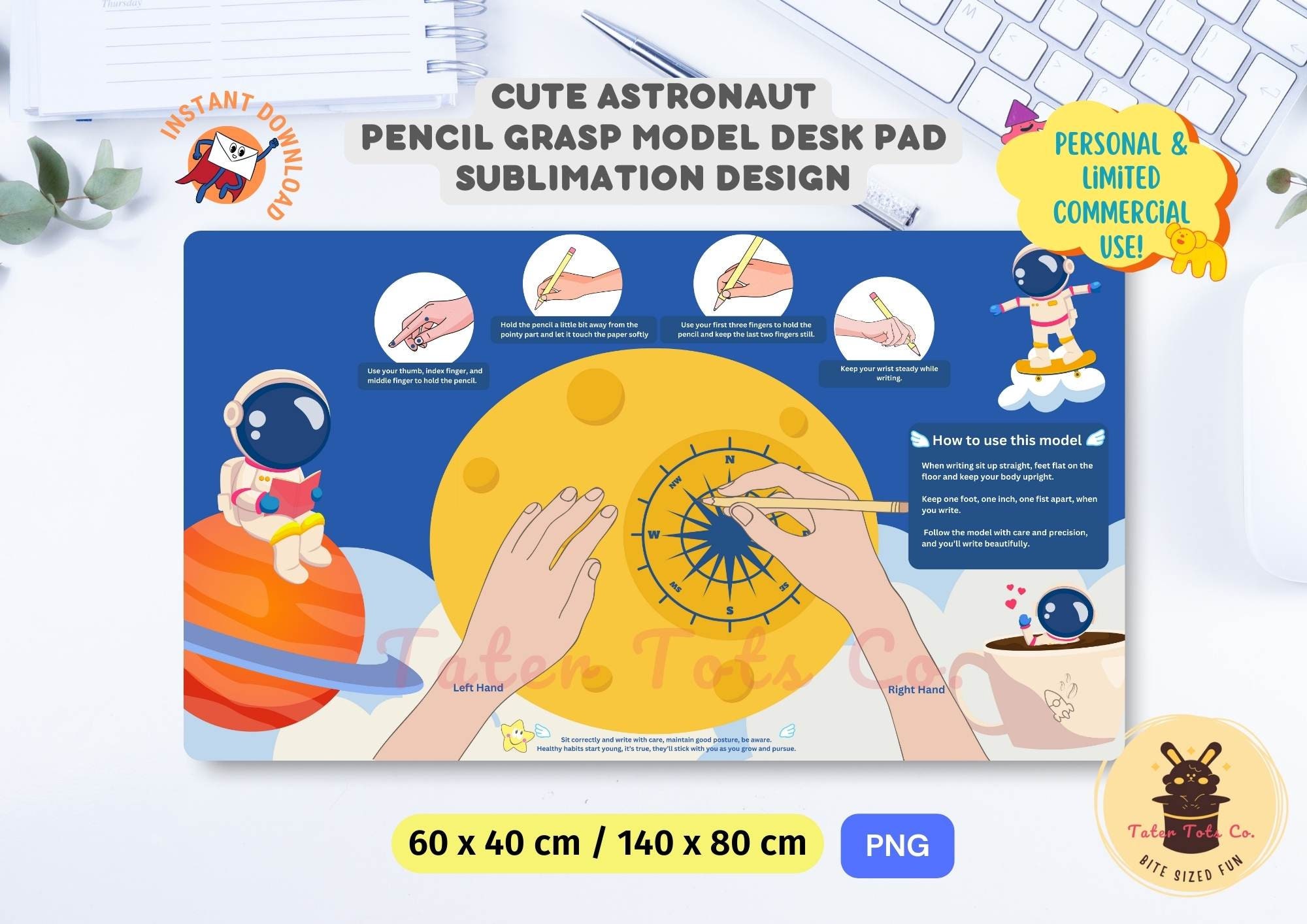 Enhance your child's handwriting skills with our Kids' Handwriting Desk Pad design featuring Cute Space Astronaut and Pencil Grasp Illustrations.