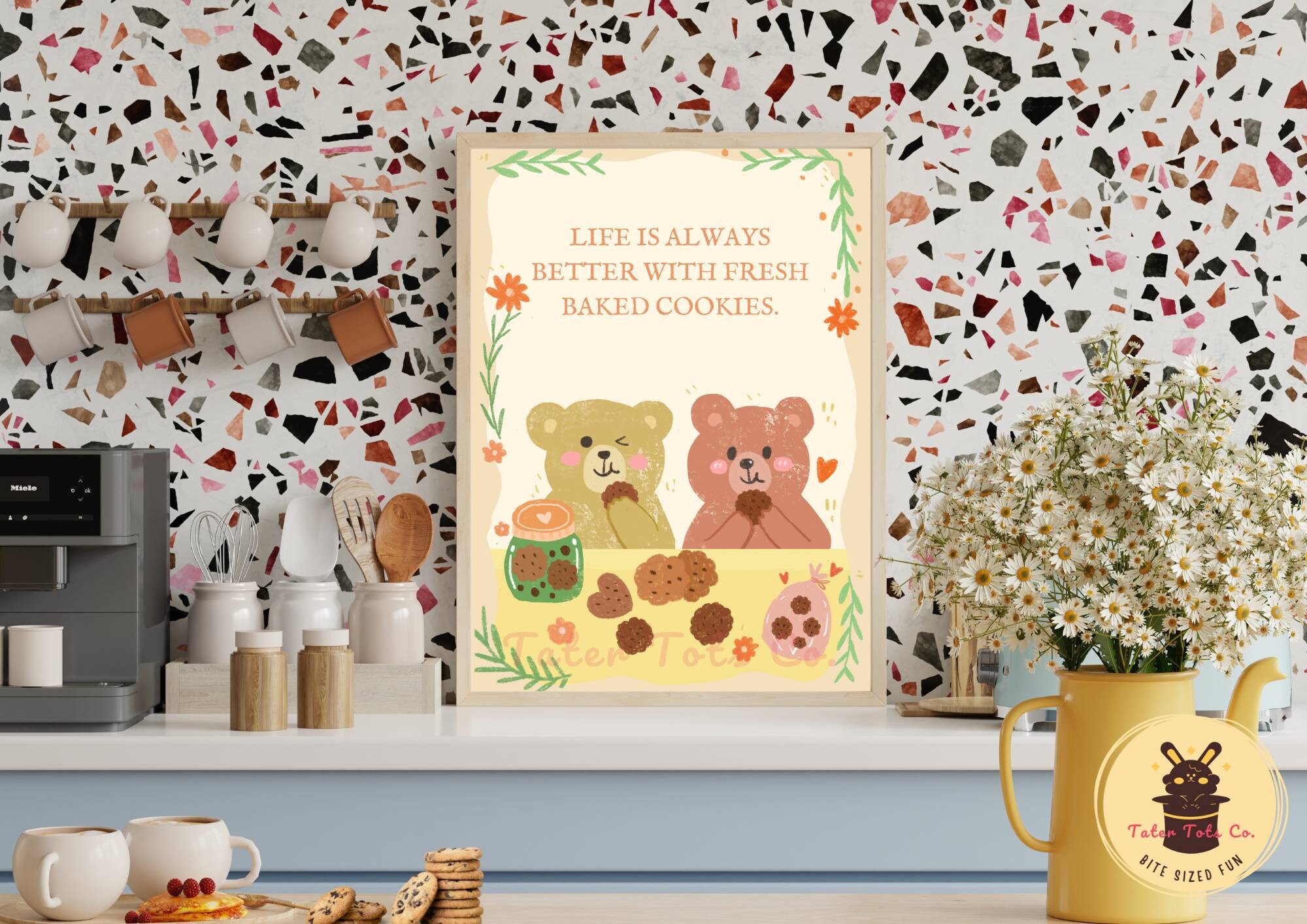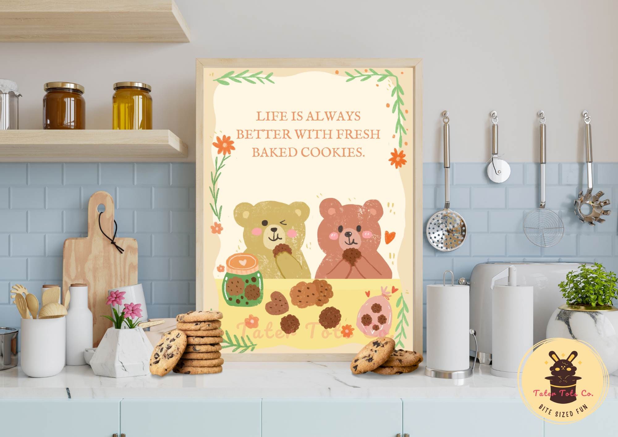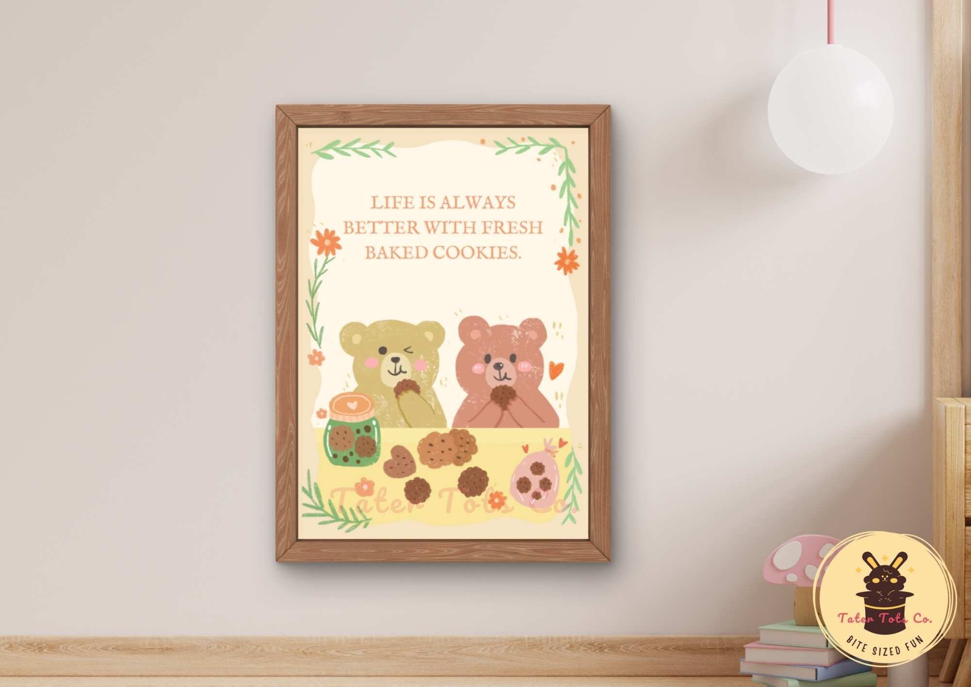 Bring a touch of whimsy and positivity to your walls with this charming hand-drawn illustration featuring adorable bears enjoying delicious cookies. Suitable for kids' rooms, nurseries, or any space that needs extra cuteness, this instant download PDF wall art print is easy to print and frame.