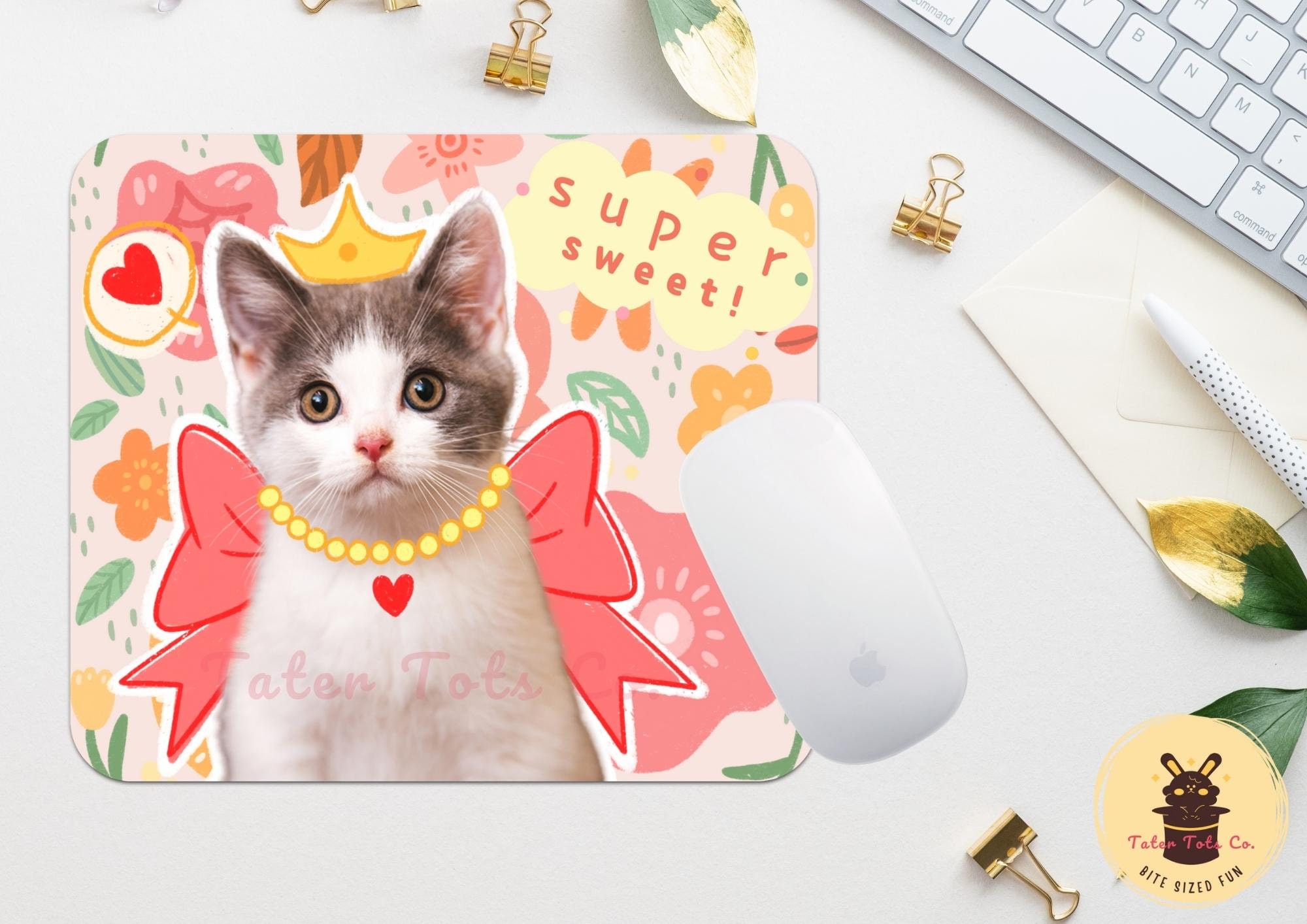 Elevate your workspace with this adorable mouse pad featuring a cute crown/ribbon cat against a backdrop of vibrant hand-drawn spring flowers.