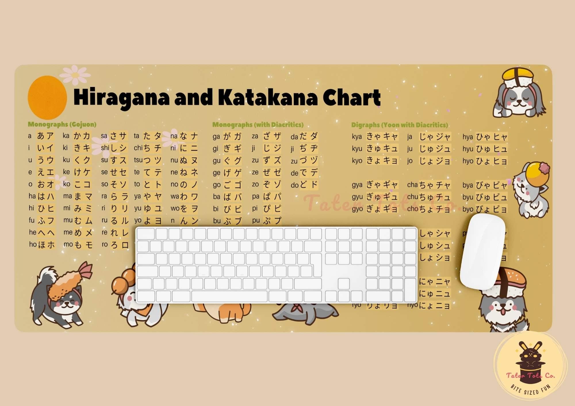 This delightful desk mat showcases a sublimation design that blends cute dog illustrations with oishi food delicacies, along with essential Japanese characters, specifically hiragana and katakana. Suitable for beginners, this chart acts as a fun and interactive resource for grasping the basics of the Japanese writing system.