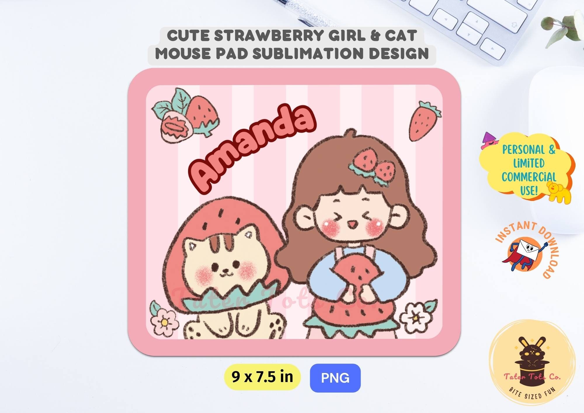 Cute Hand drawn Strawberry Girl and Cat Pink Sublimation Design Mousepad Rectangle Mouse pad Design Instant Download PNG