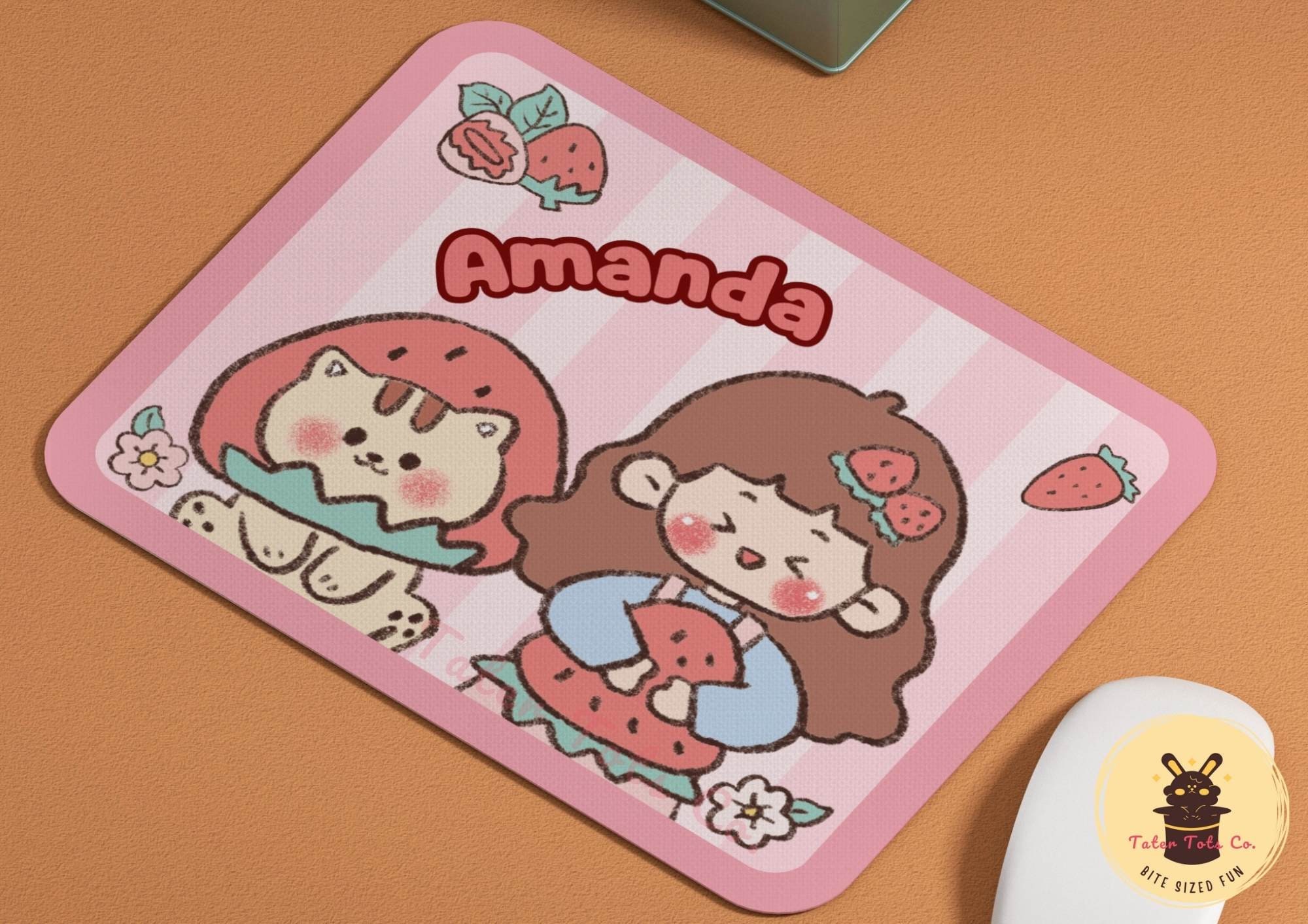 Add some sweetness and charm to your desk with this cute strawberry girl and cat pink mouse pad design. This sublimation design features a lovely hand-drawn illustration of a girl holding a strawberry and a cat with a strawberry hat. Whether you need a mouse pad for work, gaming, or browsing, this cute strawberry girl and cat pink mouse pad will brighten up your day.