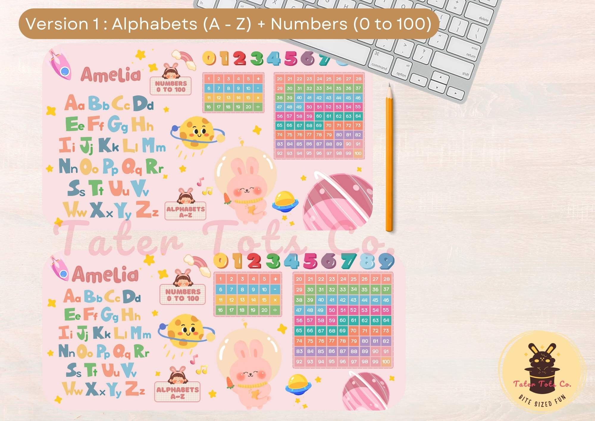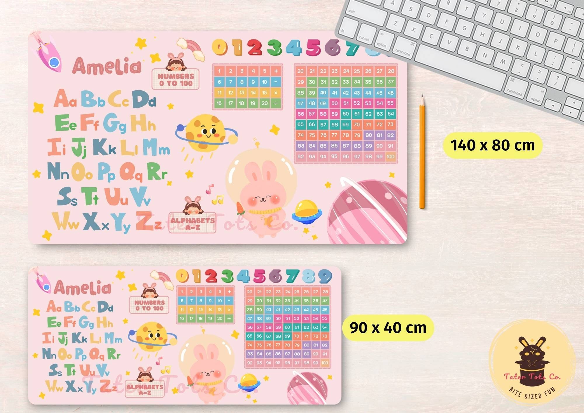 Cute Pink Space Bunny and Girl Desk Pad Table Mat Design Sublimation PNG with Alphabets and Numbers 1 to 100 Math Chart Instant Download