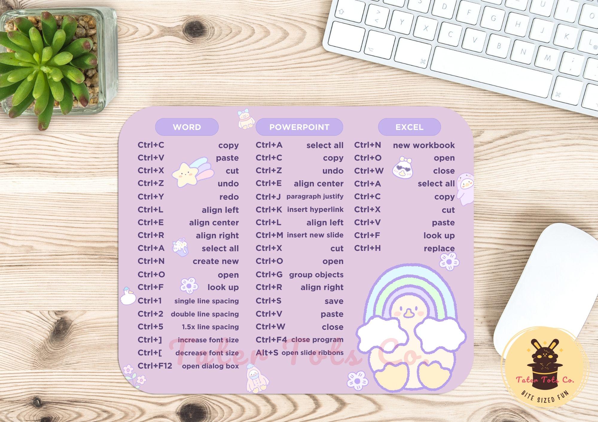 It consists of basic Words, Excel, and Powerpoint shortcut keys for Windows to improve productivity and it adds a touch of playful charm to your work setup.