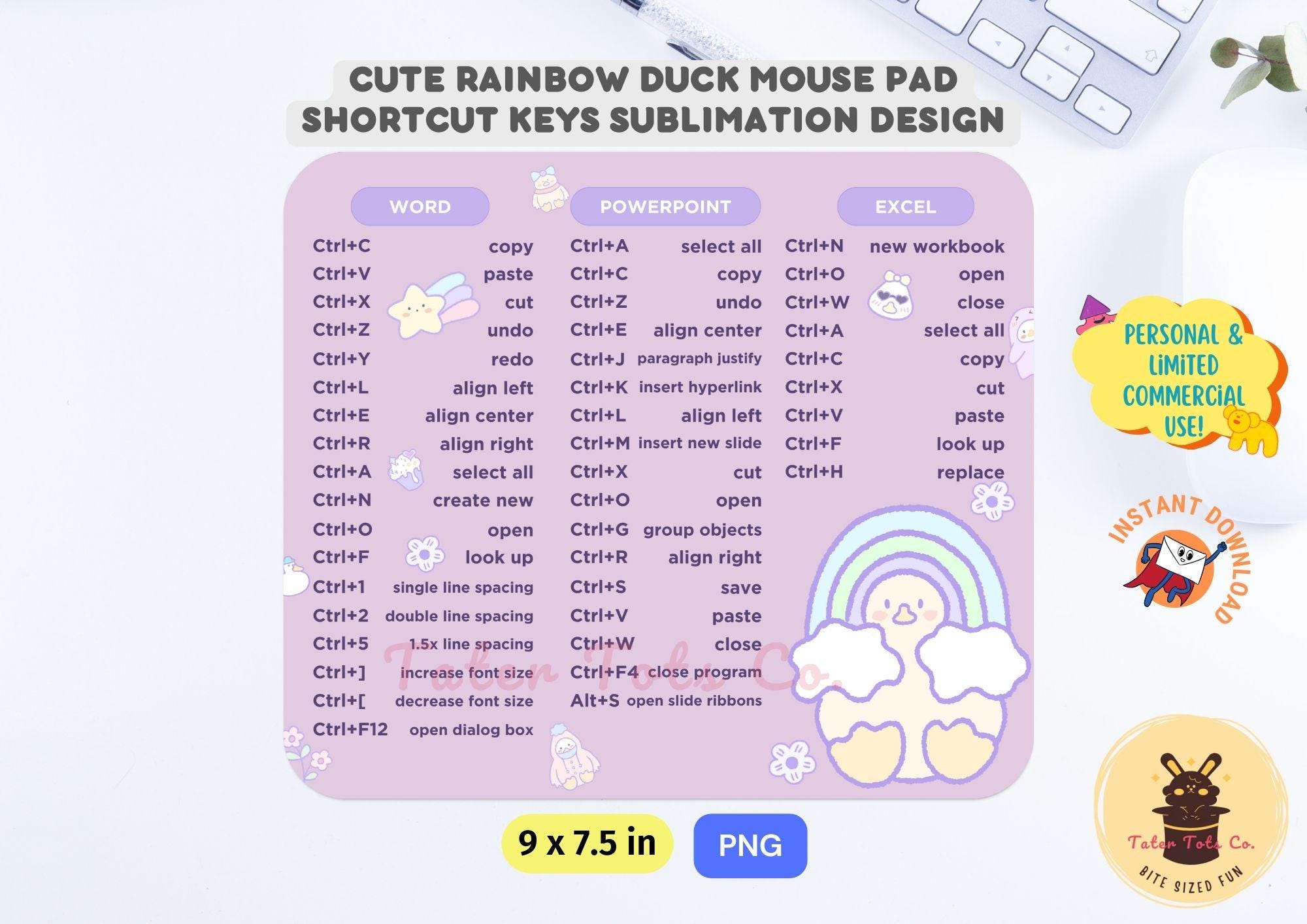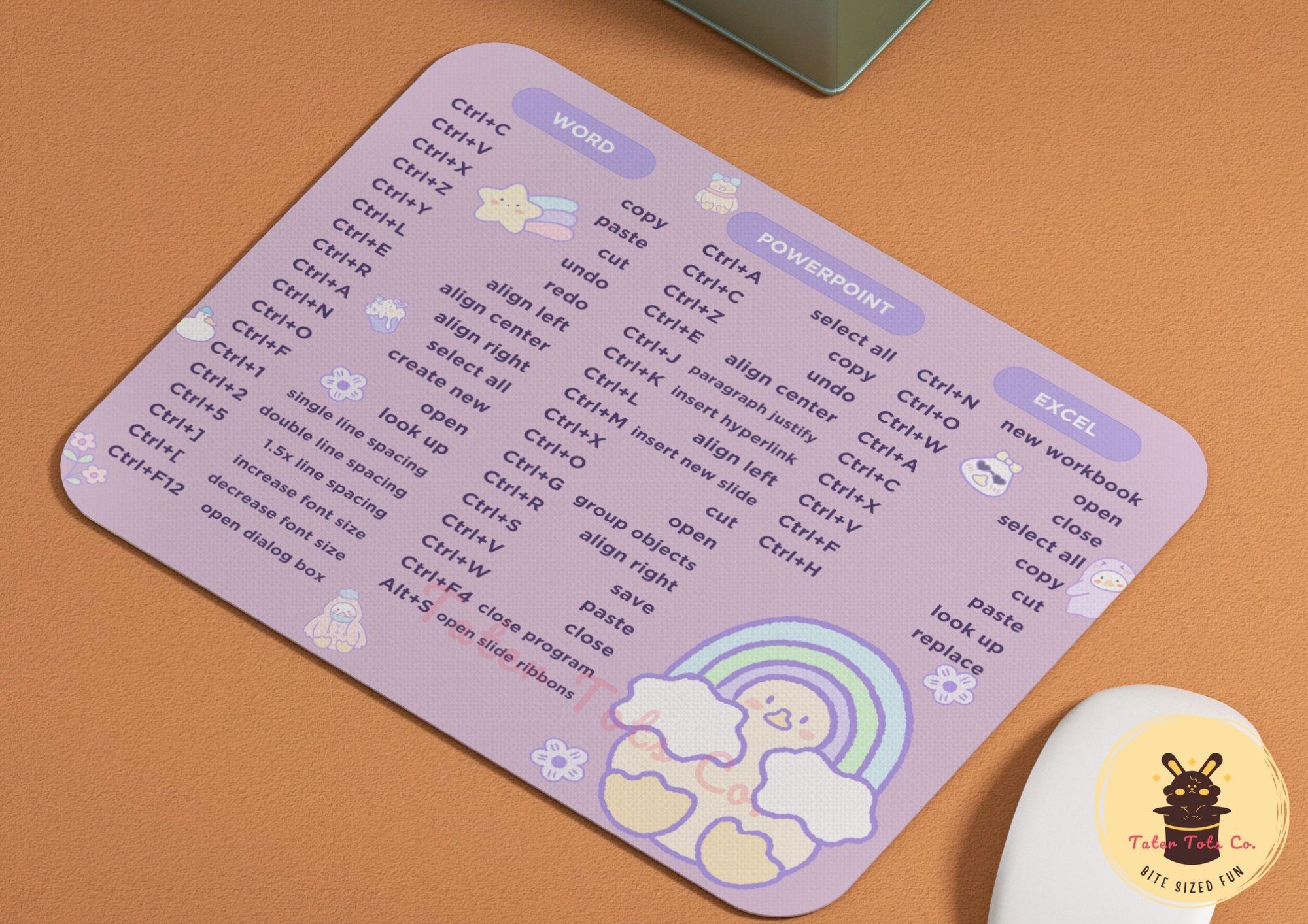 Cute Rainbow Duck Words, Excel, and Powerpoint Shortcut Keys for Windows Productivity Mousepad Png Sublimation Rectangle Mouse pad Design