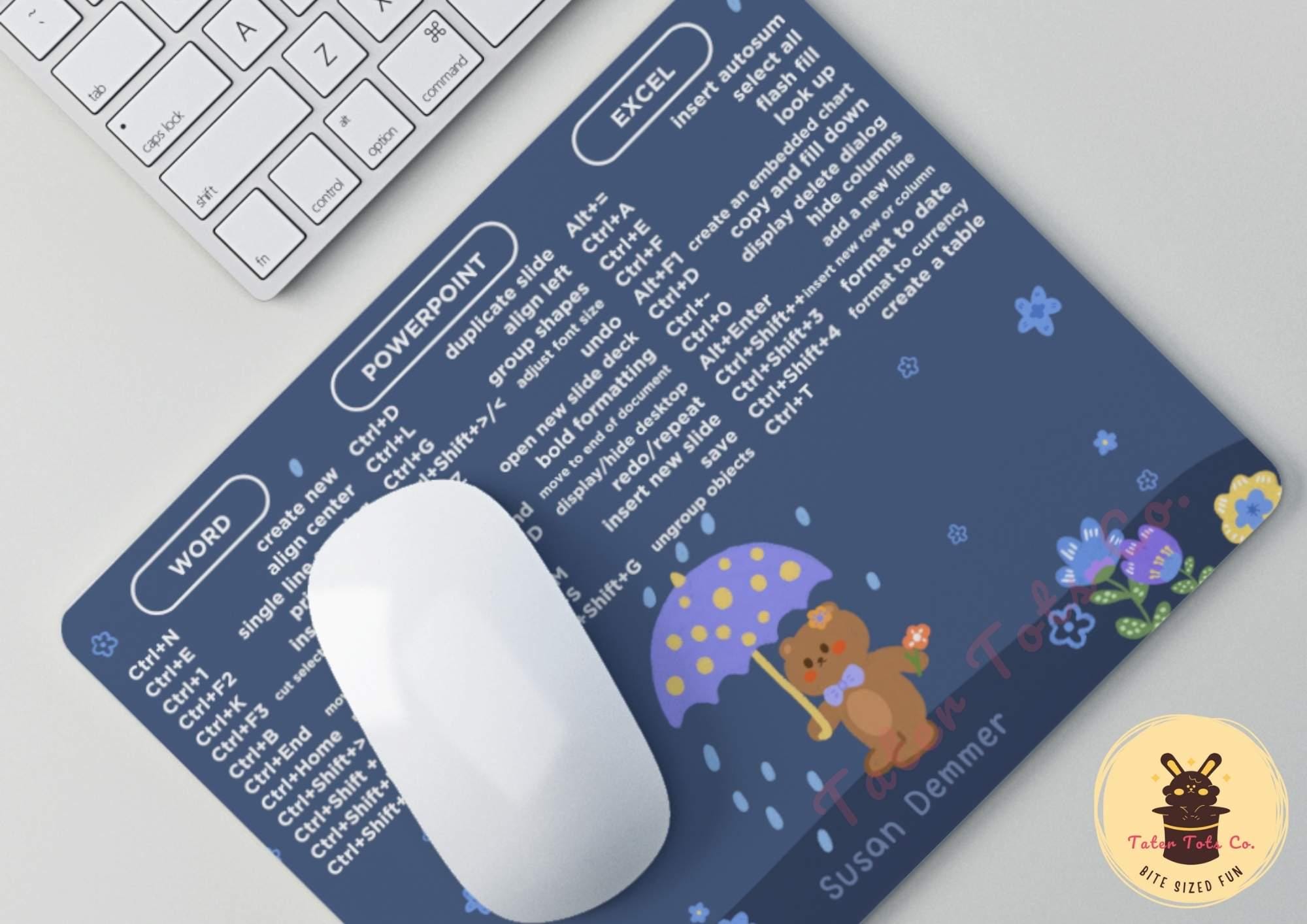 Cute Rainy Bear (Blue) Productivity Mousepad Design Words, Excel, and Powerpoint Shortcut Keys for Windows Instant Download PNG