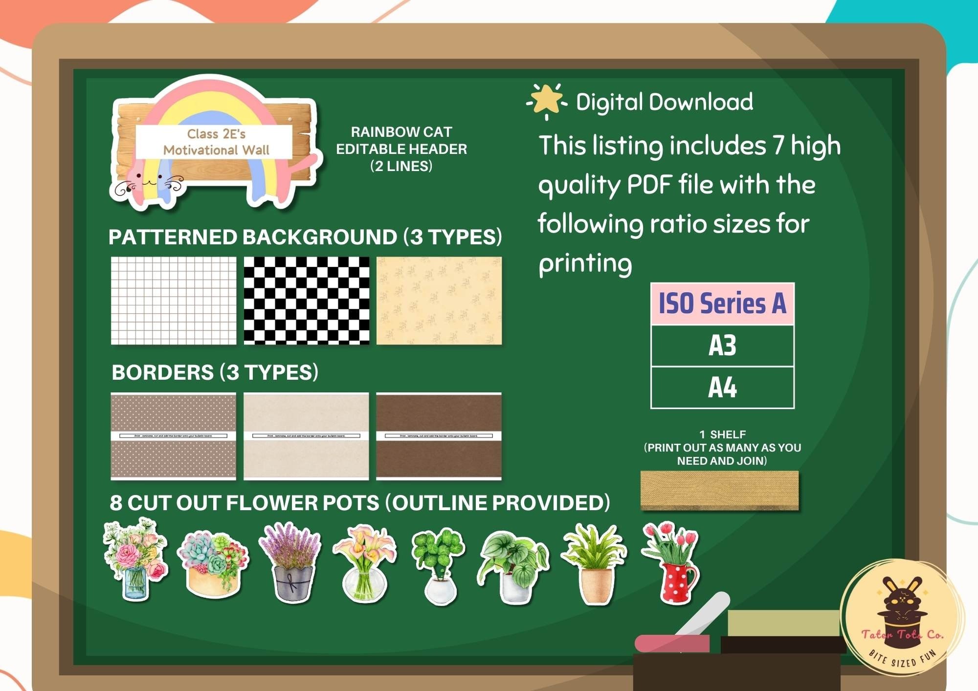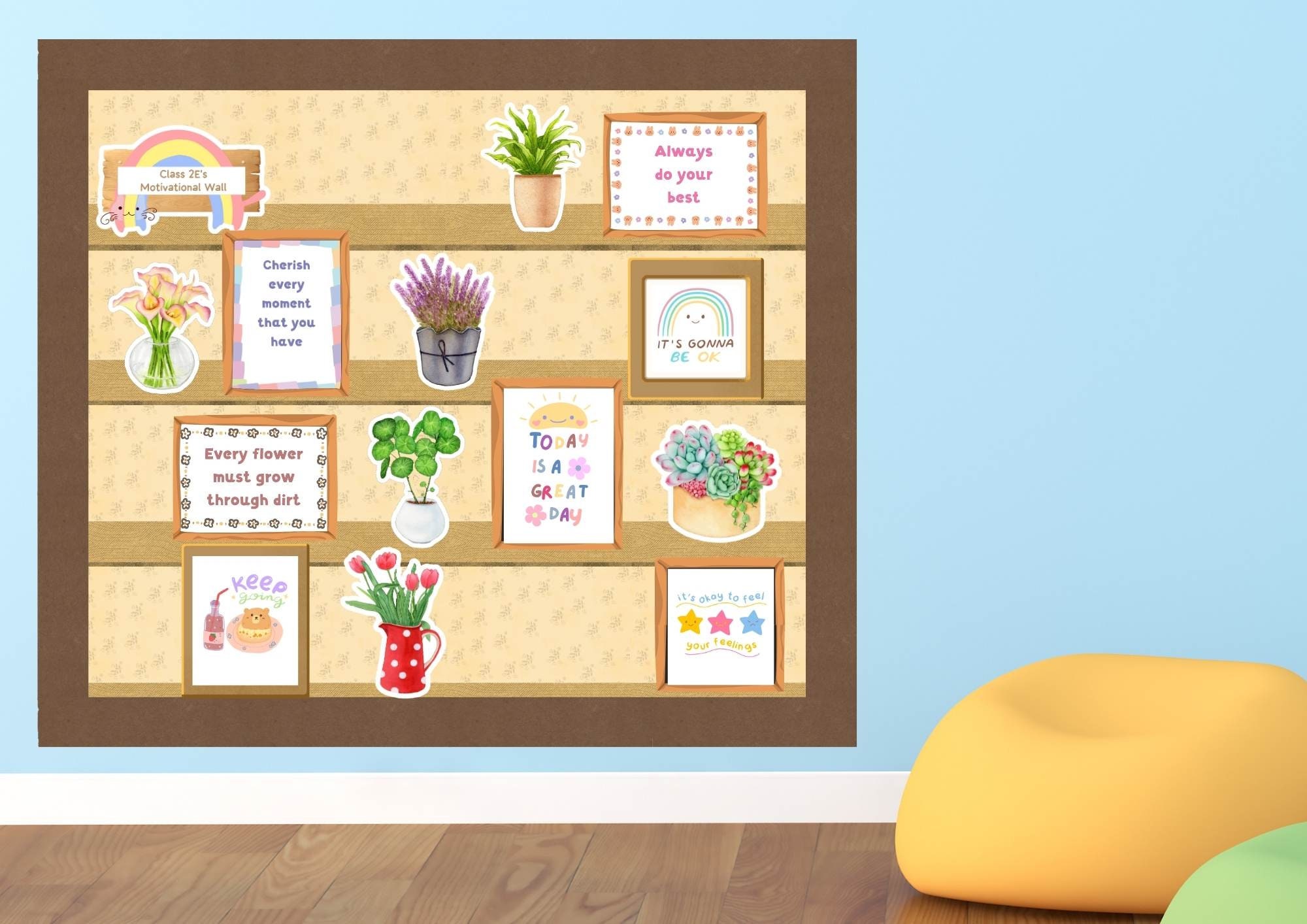 Add a touch of color and motivation to any section of your classroom, be it a reading corner, calming corner, door, or bulletin board. The pack includes various decorative elements such as watercolor flowers and plants, frames with motivational quotes, shelf displays, colorful borders, and patterned backgrounds. You can print, mix, and match the pieces according to your preferences.