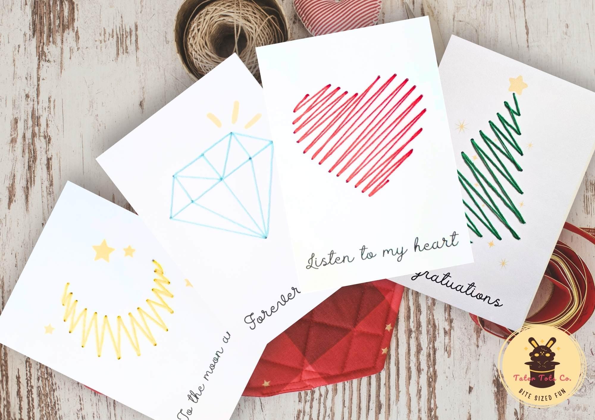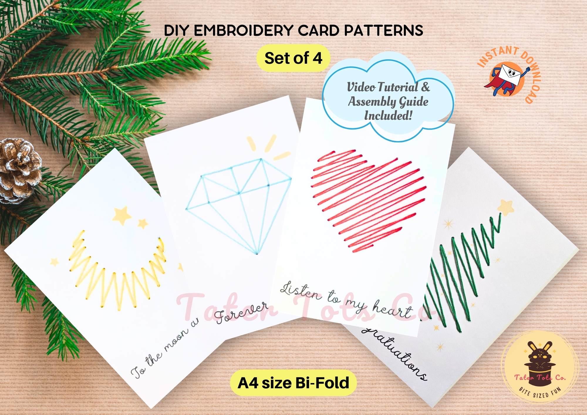 DIY Embroidery Card Patterns Bundle of 4 – Beginner Level Instant Download PDF (Christmas Tree, Heart, Crescent Moon, Diamond)
