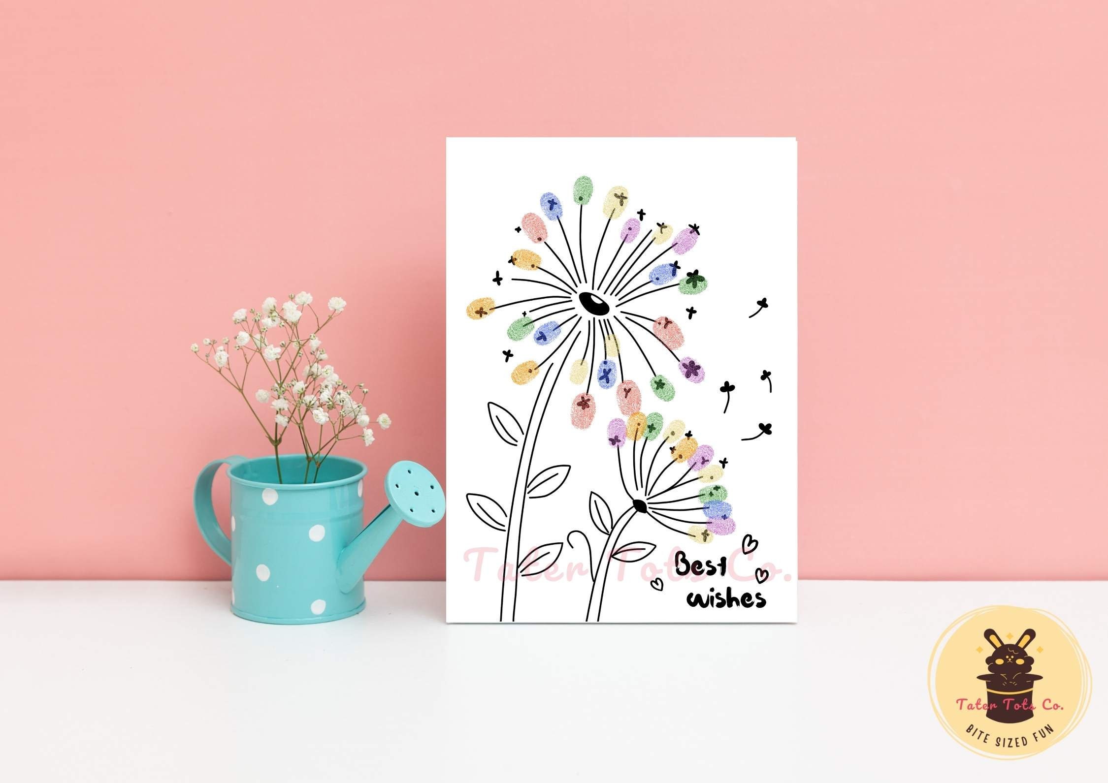Suitable for kids to create unique and personalized thank you cards. This bundle includes five charming A4-size bi-folded card designs, featuring whimsical flowers and trees that can be decorated with colorful fingerprints.