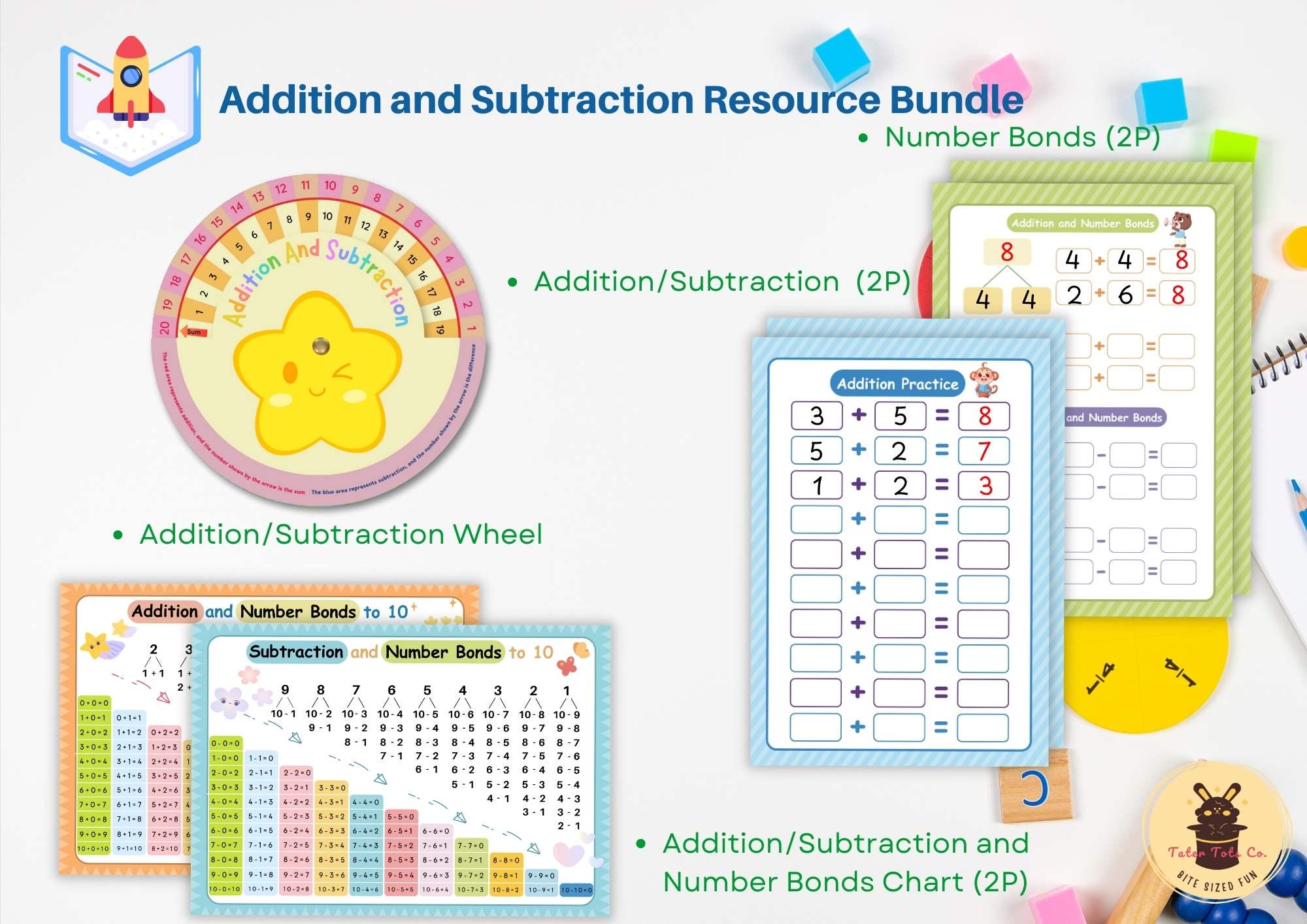 ✅ Addition/Subtraction Number Bonds Math Chart to 10 (2 pages): A colorful chart visually represents addition and subtraction facts, helping children quickly grasp the concepts.