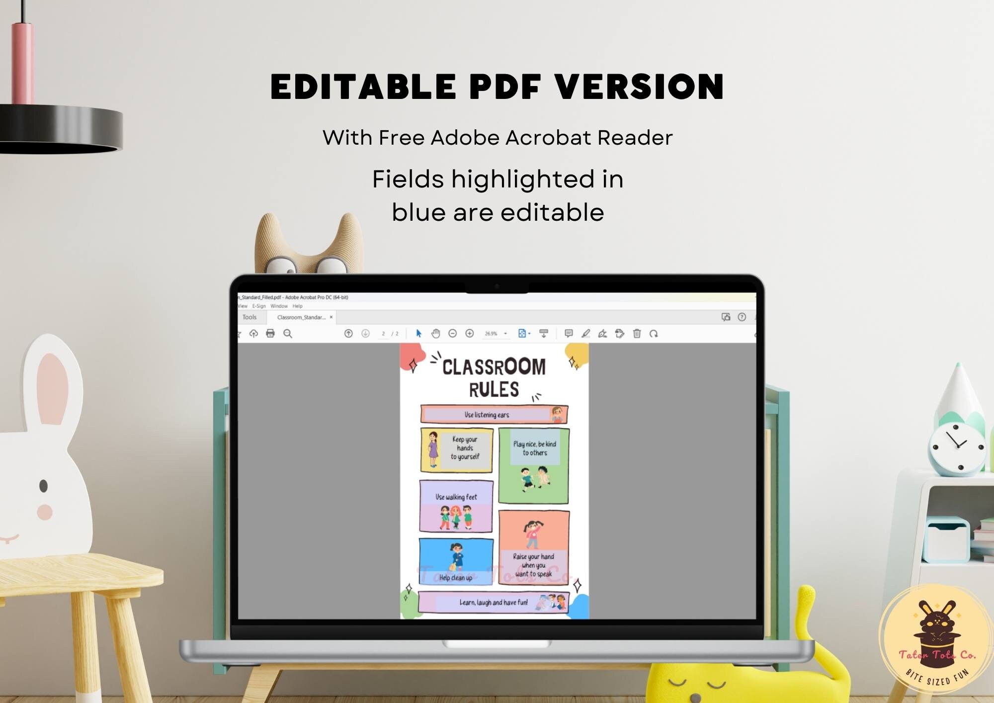 You can now edit both Title and Rules in this Editable PDF for a more personalized classroom rules template. You can edit 2 title rows. If you do not wish to edit the title and leave it as "Classroom Rules," then you can use the Editable PDF for rules only.