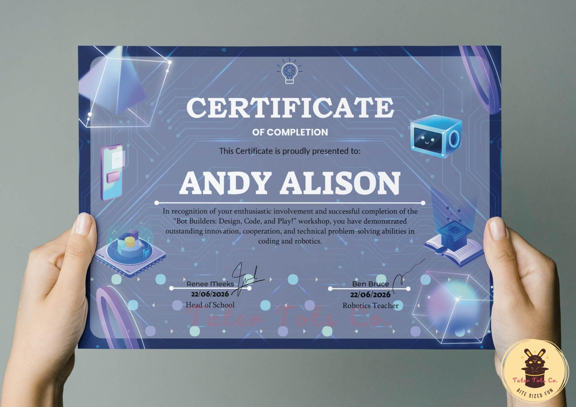Simply download your A4-sized PDF file and personalize it with any student’s name, course details, and award date using Adobe Acrobat Reader. The certificate features eye-catching, tech-inspired graphics, making it a wonderful keepsake for classroom awards, digital literacy programmes, robotics competitions, STEM camps, coding clubs, and educational milestones.