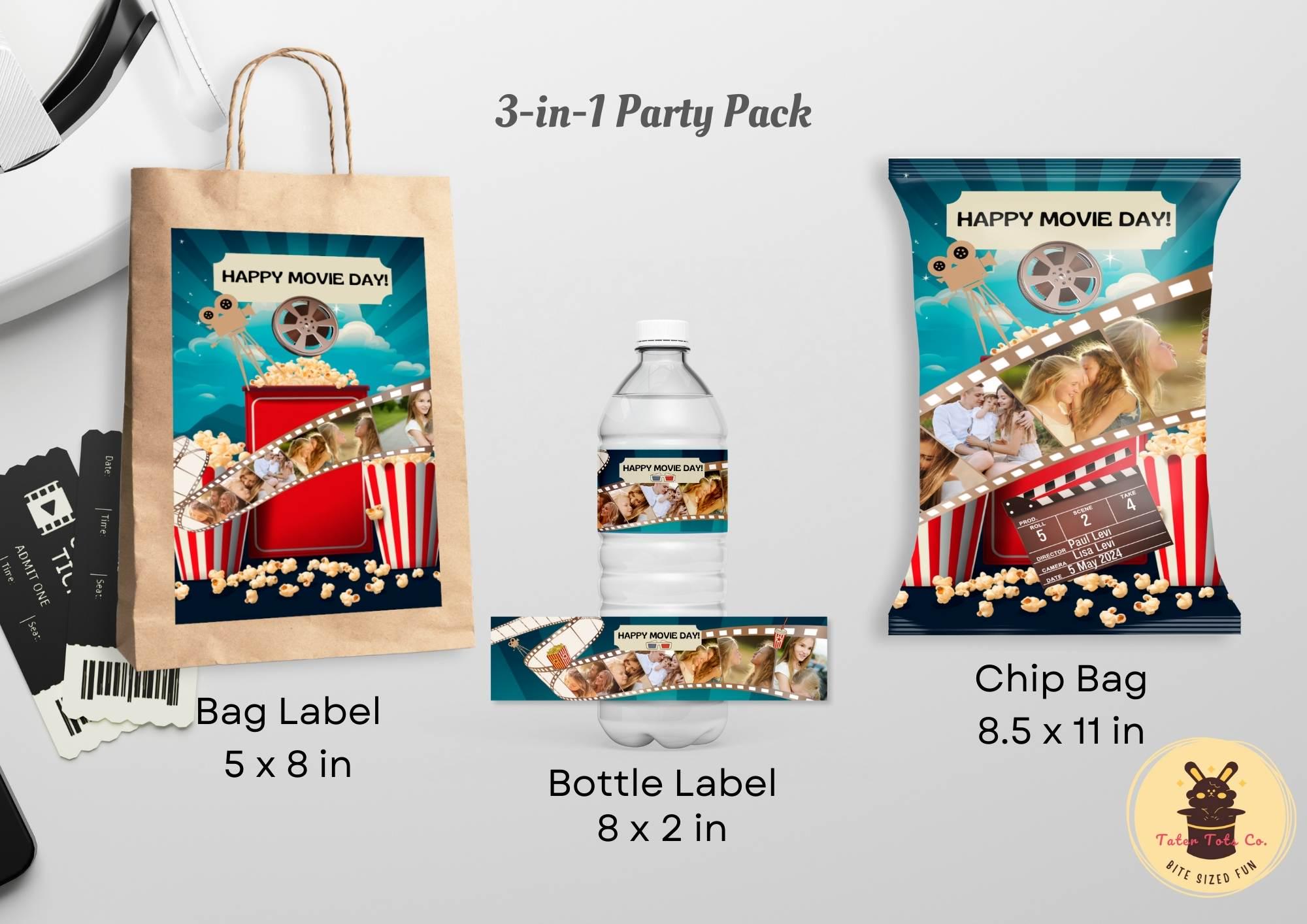 Family Movie Night Party Pack: Popcorn Film Roll-Themed Matching Chip Bag, Bottle Snack Labels | Fully Editable Canva Template