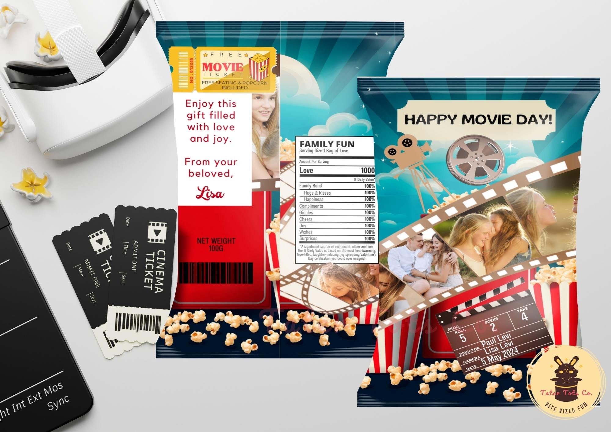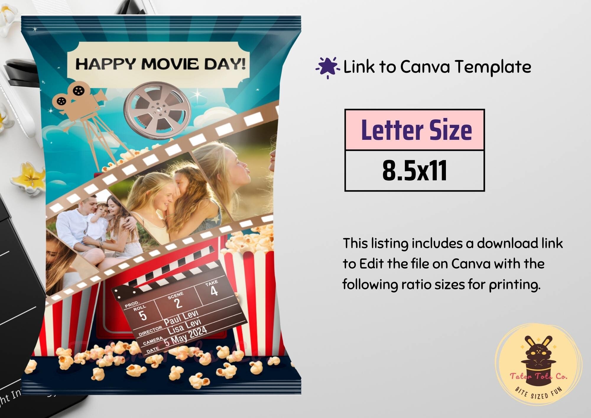 Family Movie Night Photo Collage Frame Cinema Popcorn Background Chip Bag Canva Template | Fully Editable Gift Pack Label Instant Access