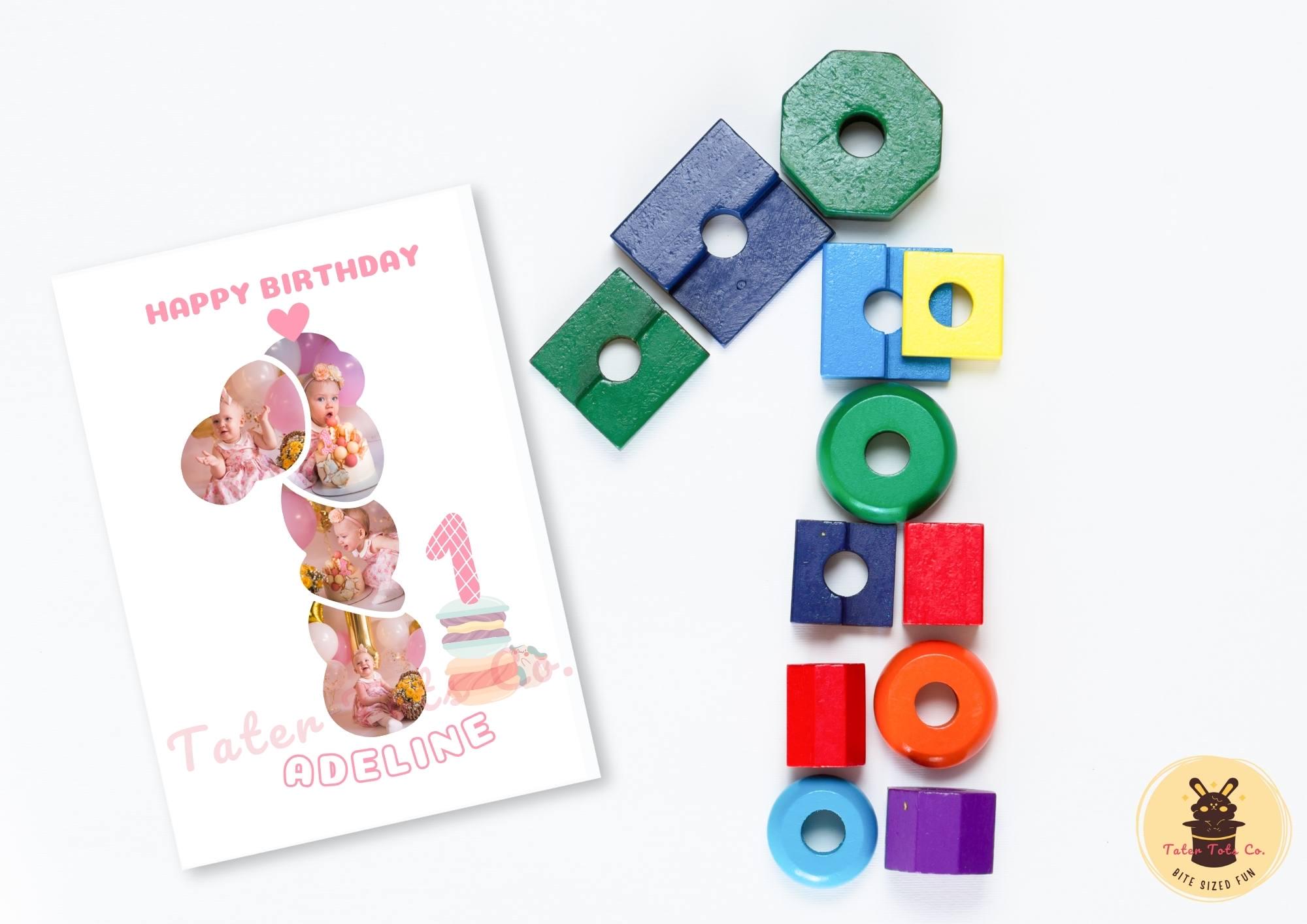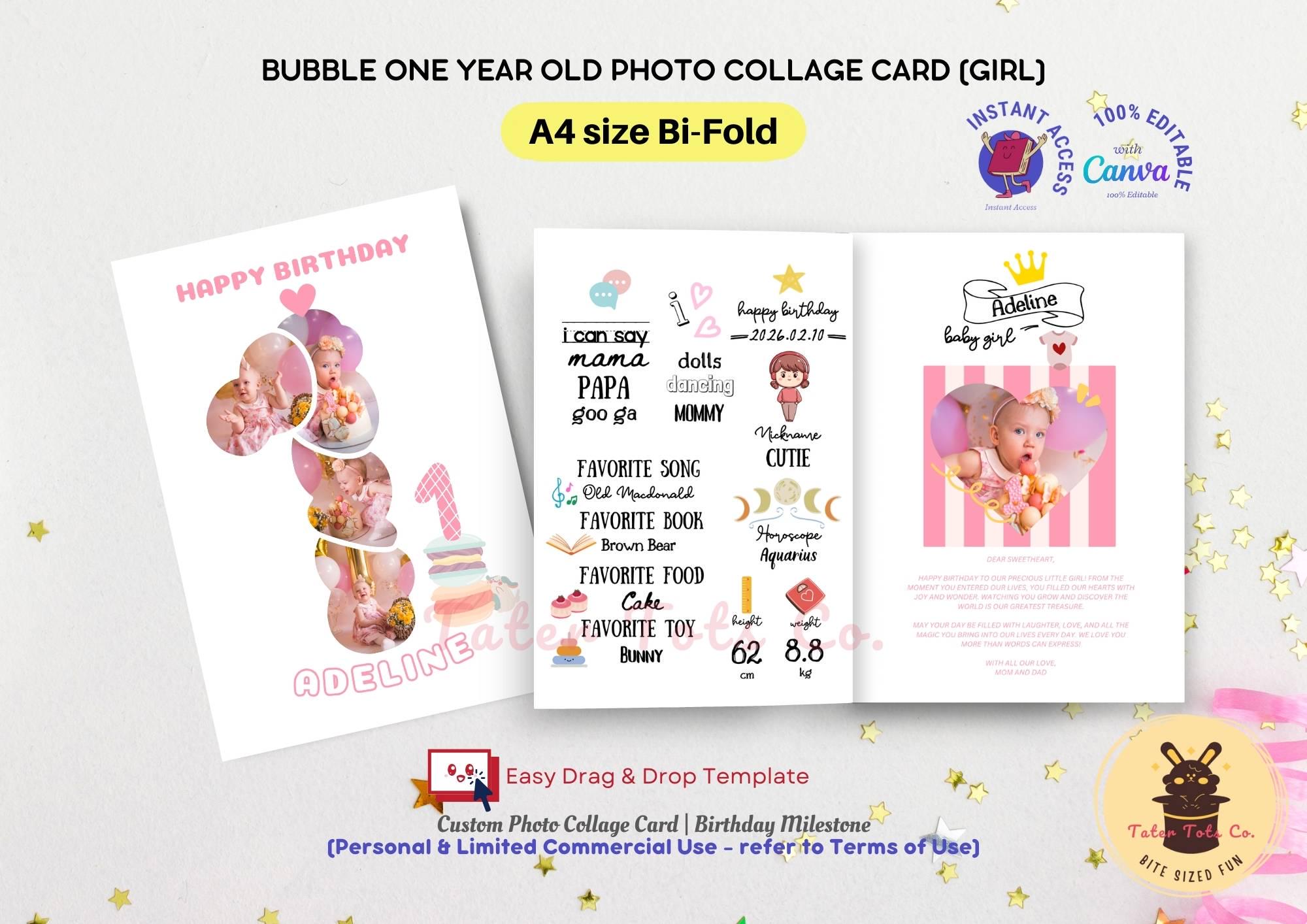 Girl's 1st Birthday Card: Photo Collage Canva Template (Digital Download)