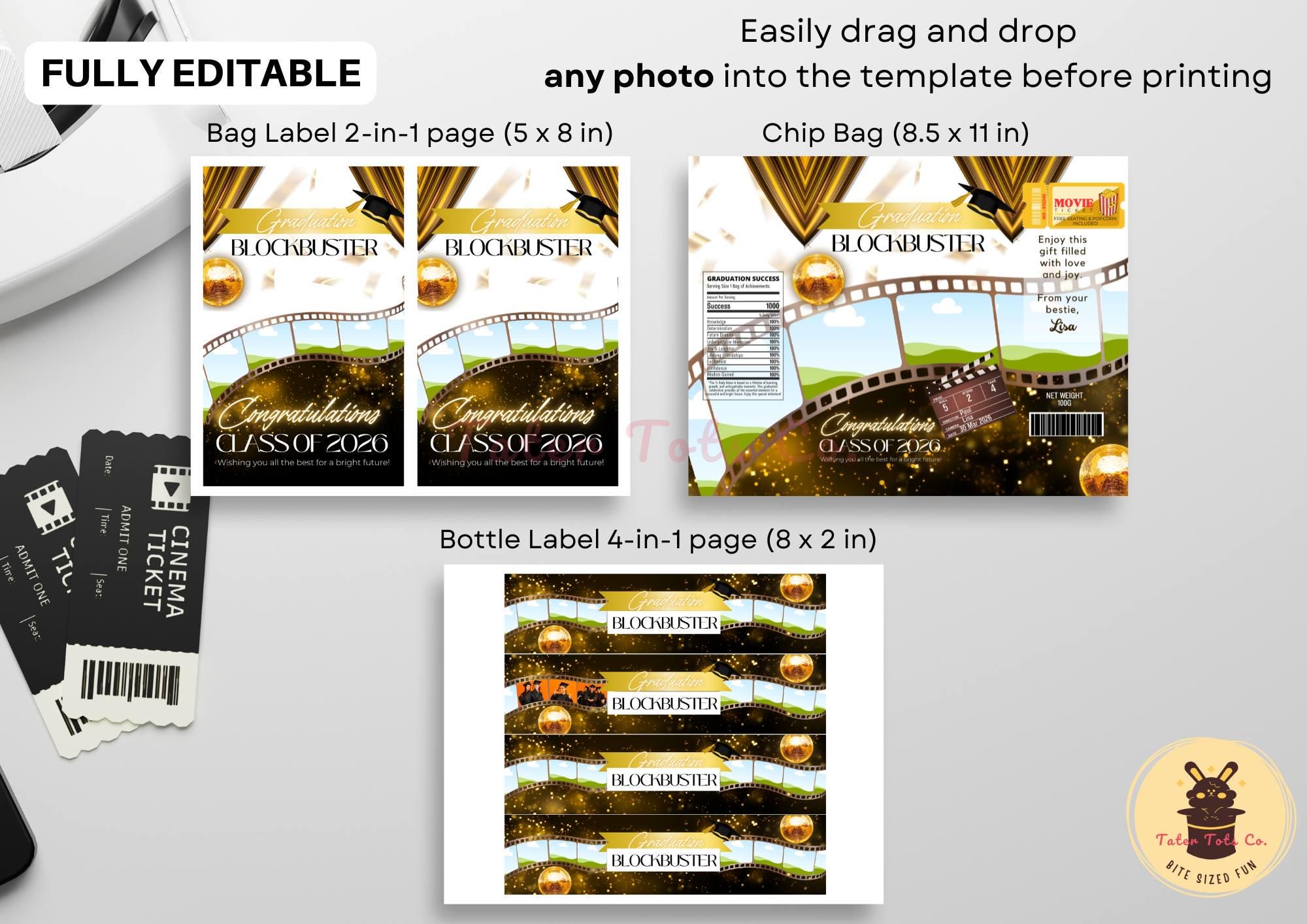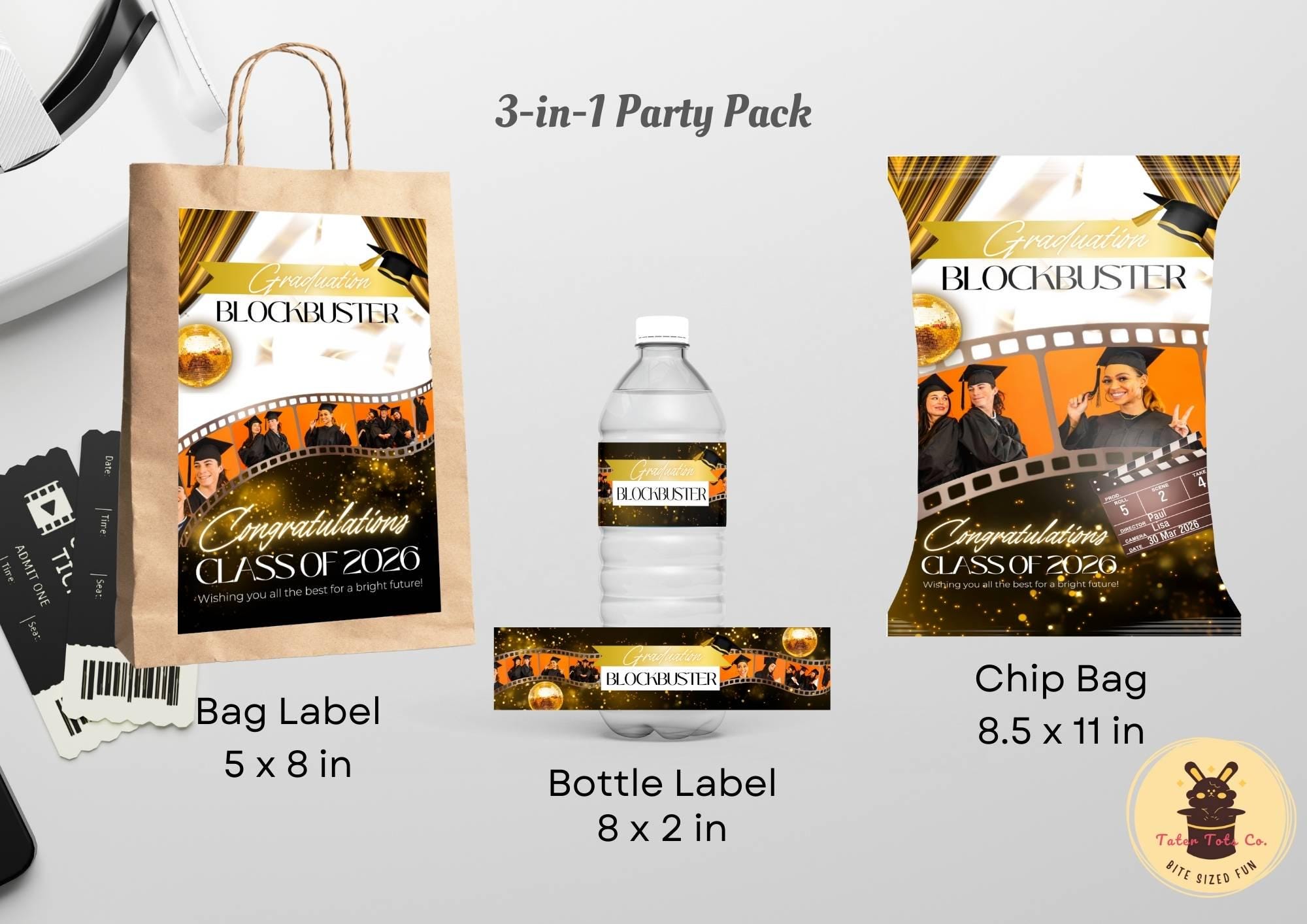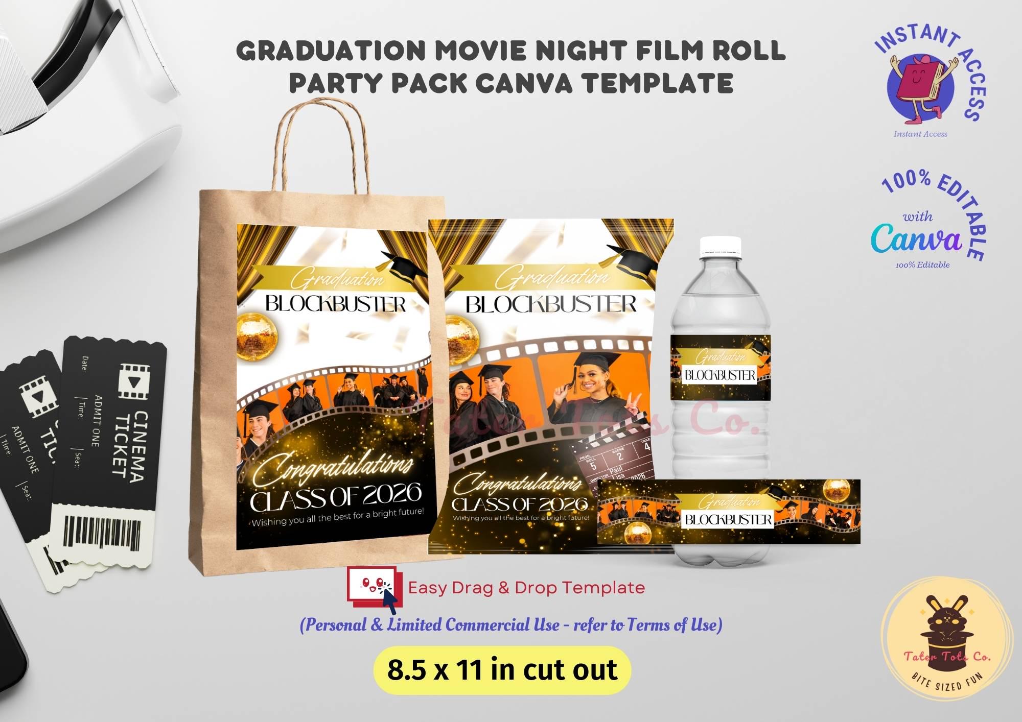 Graduation Movie Night Party Pack: Film Roll-Themed Matching Chip Bag, Bottle Snack Labels | Fully Editable Canva Template