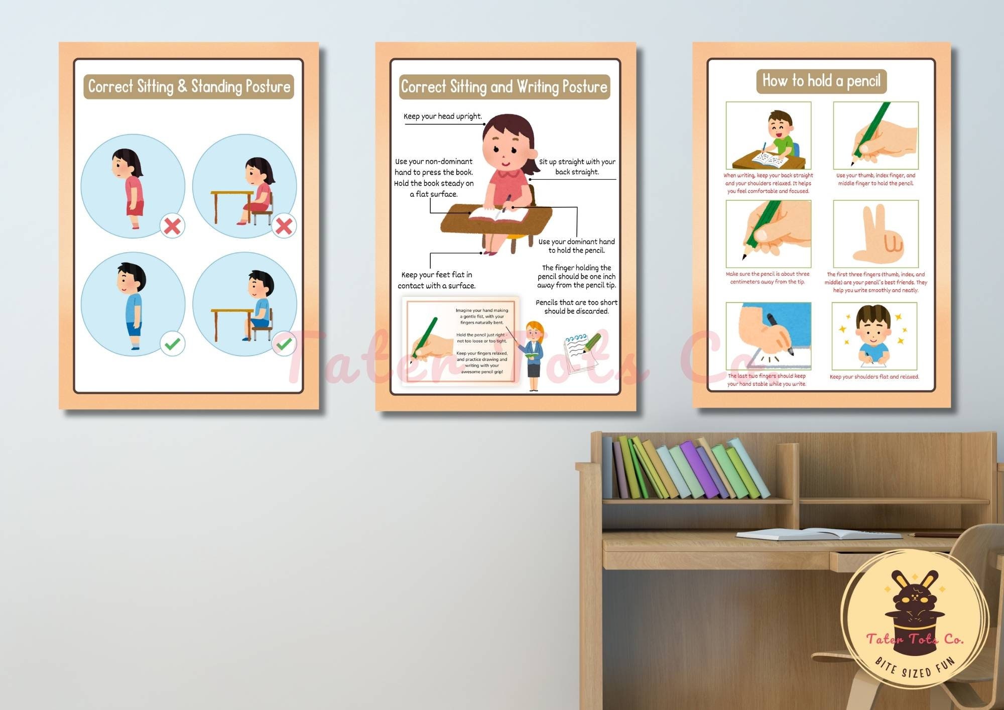 Correct Standing and Writing Posture, Pencil Grip Infographic Posters