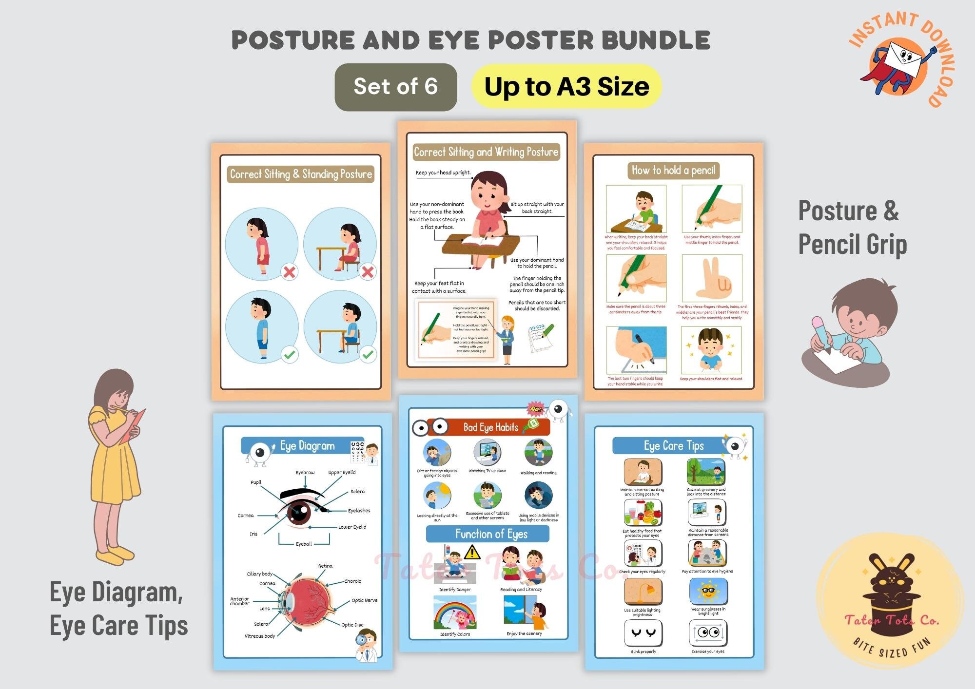 Healthy Posture and Eye Care Bundle for Kids: Improving Physical and Visual Health Set of 6 Infographic Guide Instant Download (PDF)