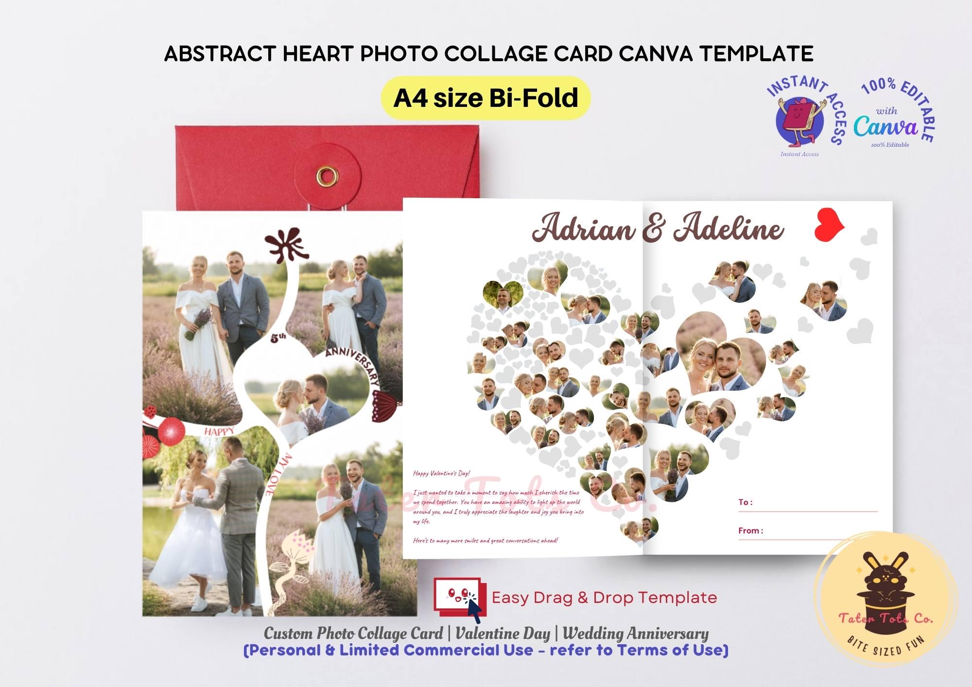 Elevate your special occasions with our Abstract Heart Photo Collage Card Canva Template. This A4-size bi-fold card Canva Template features an abstract heart design on both the front and back covers, making it suitable for anniversaries, weddings, or heartfelt messages.