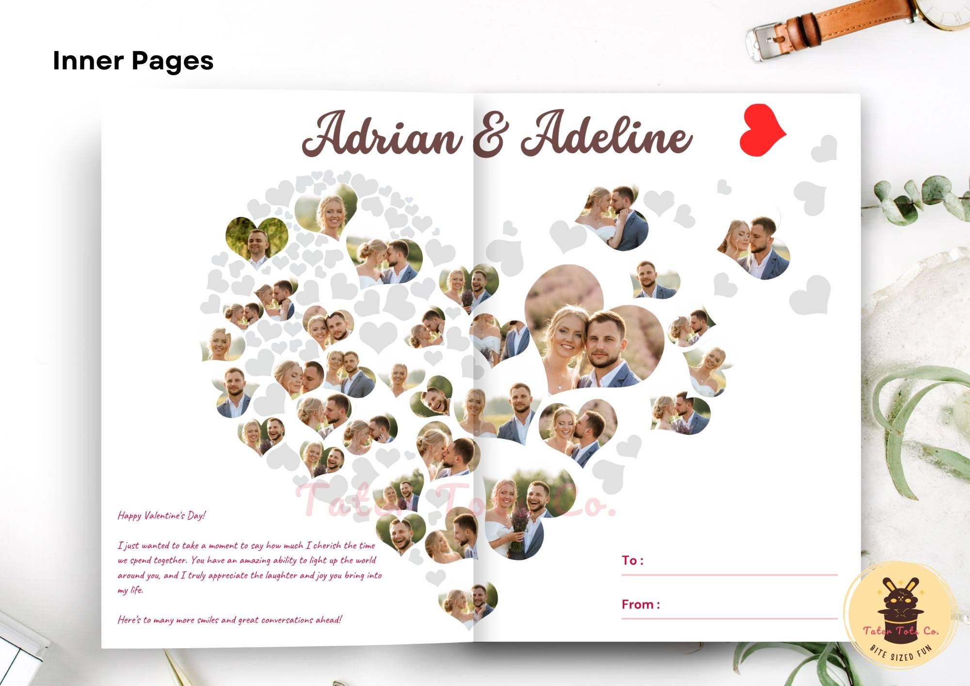 When opened, the card reveals a heart-shaped photo collage area where you can showcase your favorite memories. Personalize the card name on the front cover or message in the middle section however you like.