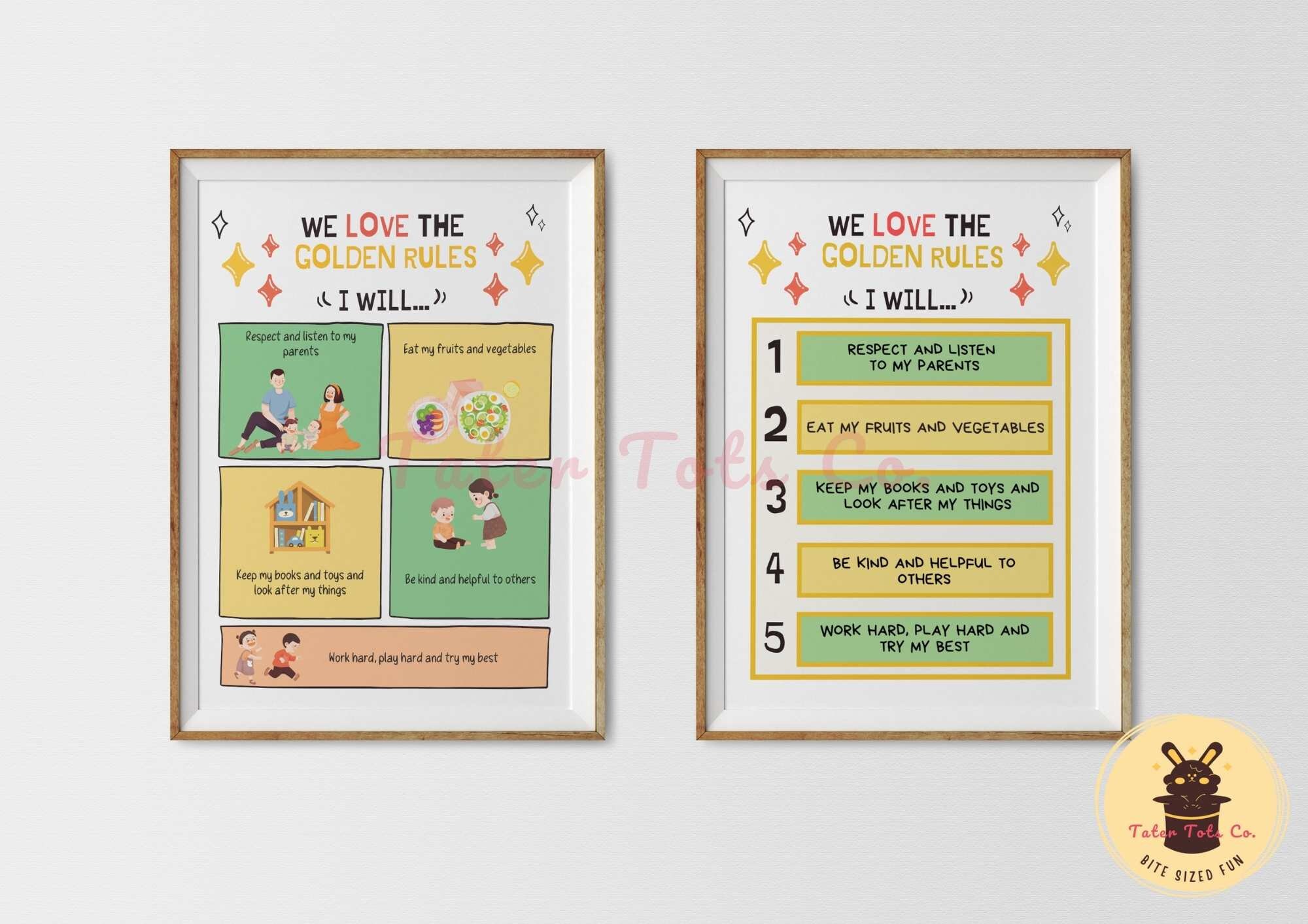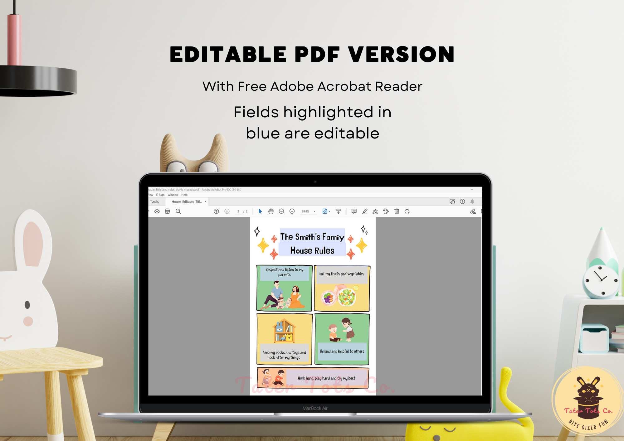 You can edit both Title and Rules in this Editable PDF for a more personalized house rules template (i.e., add in family name or child's name). You can edit 2 title rows. If you do not wish to edit the title and leave it as "We love the golden rules...", then you can use the Editable PDF for rules only.