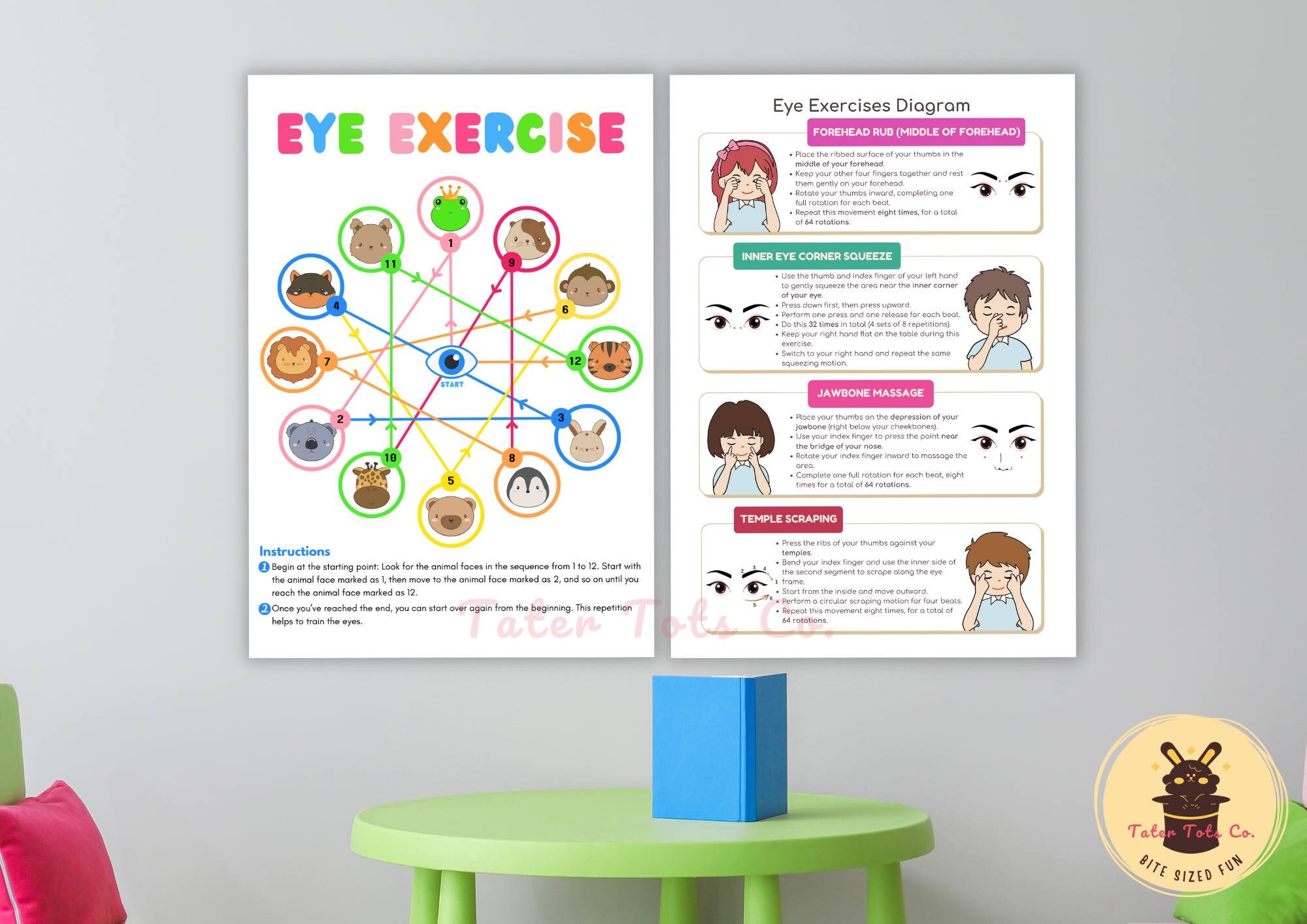 Kids' Eye Training Exercise Poster Bundle of 2: Massage Points, Relaxation for tired eyes, Visual Tracking Skills Instant Download PDF