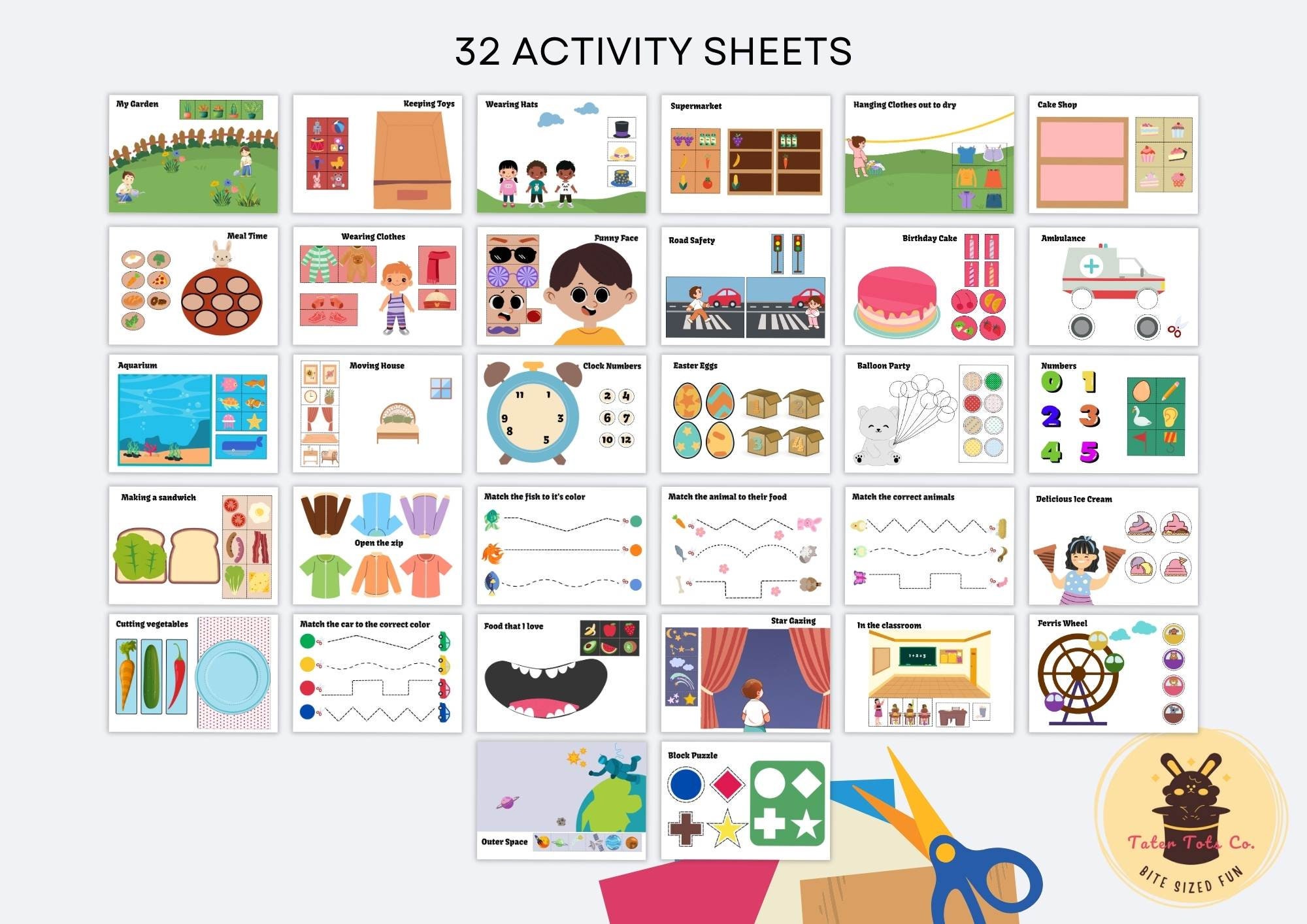 • Fun scissors cutting worksheets for kids A4 (32 activity sheets)