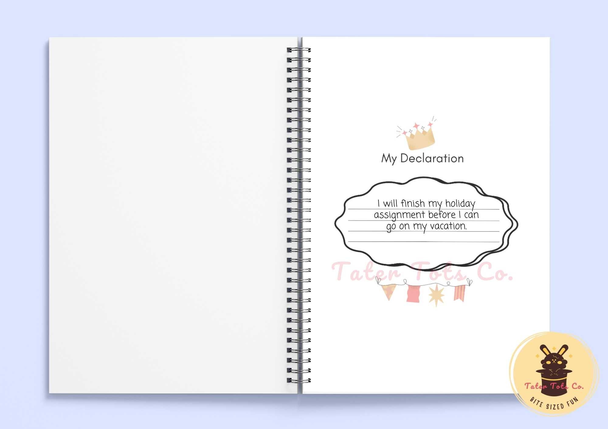 First, get your child to write a declaration before starting the journal. This declaration can be a goal or something your child wants to achieve by the end of the vacation.