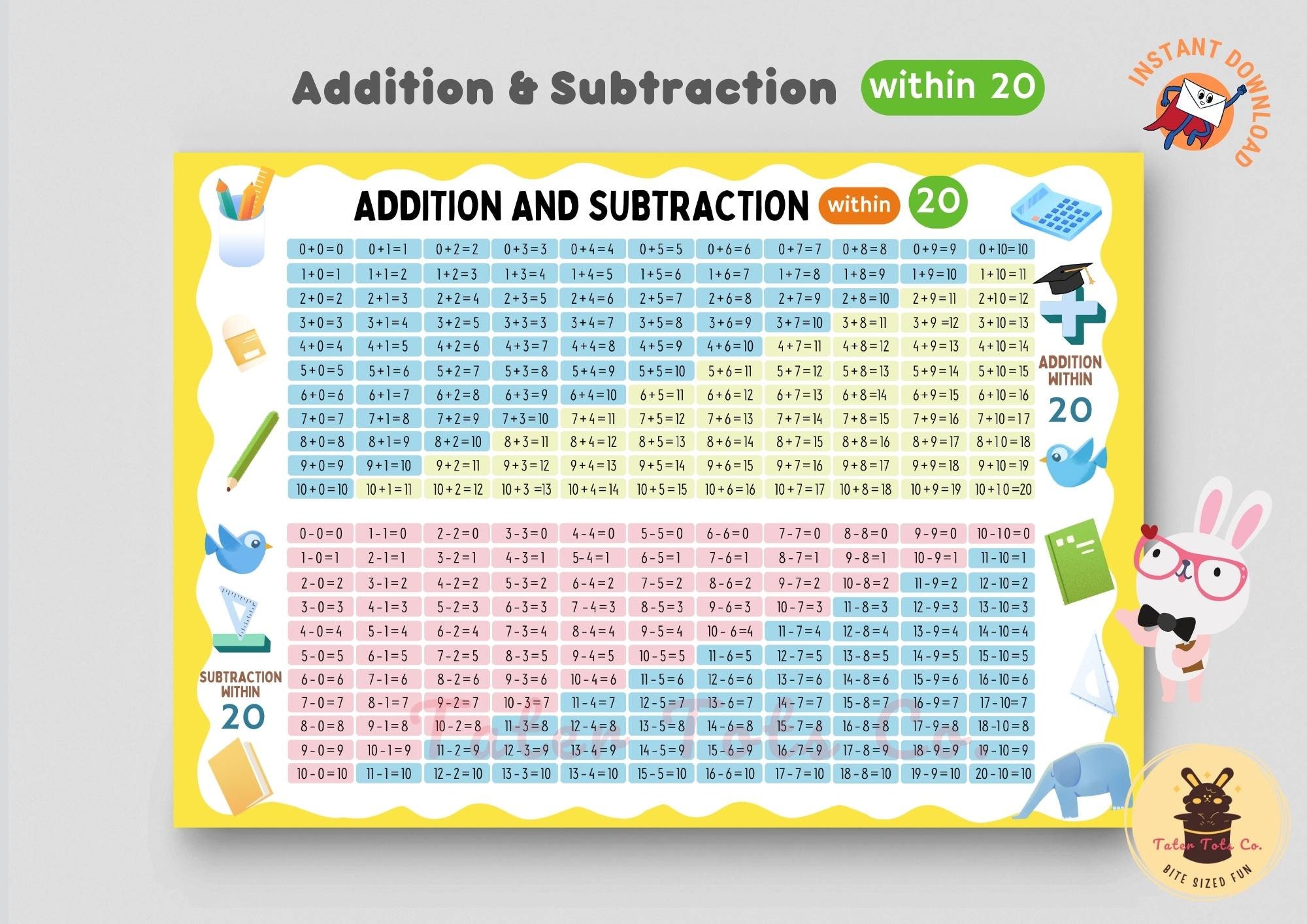 Math Number Chart Poster: Addition & Subtraction to 20 (PDF Download)