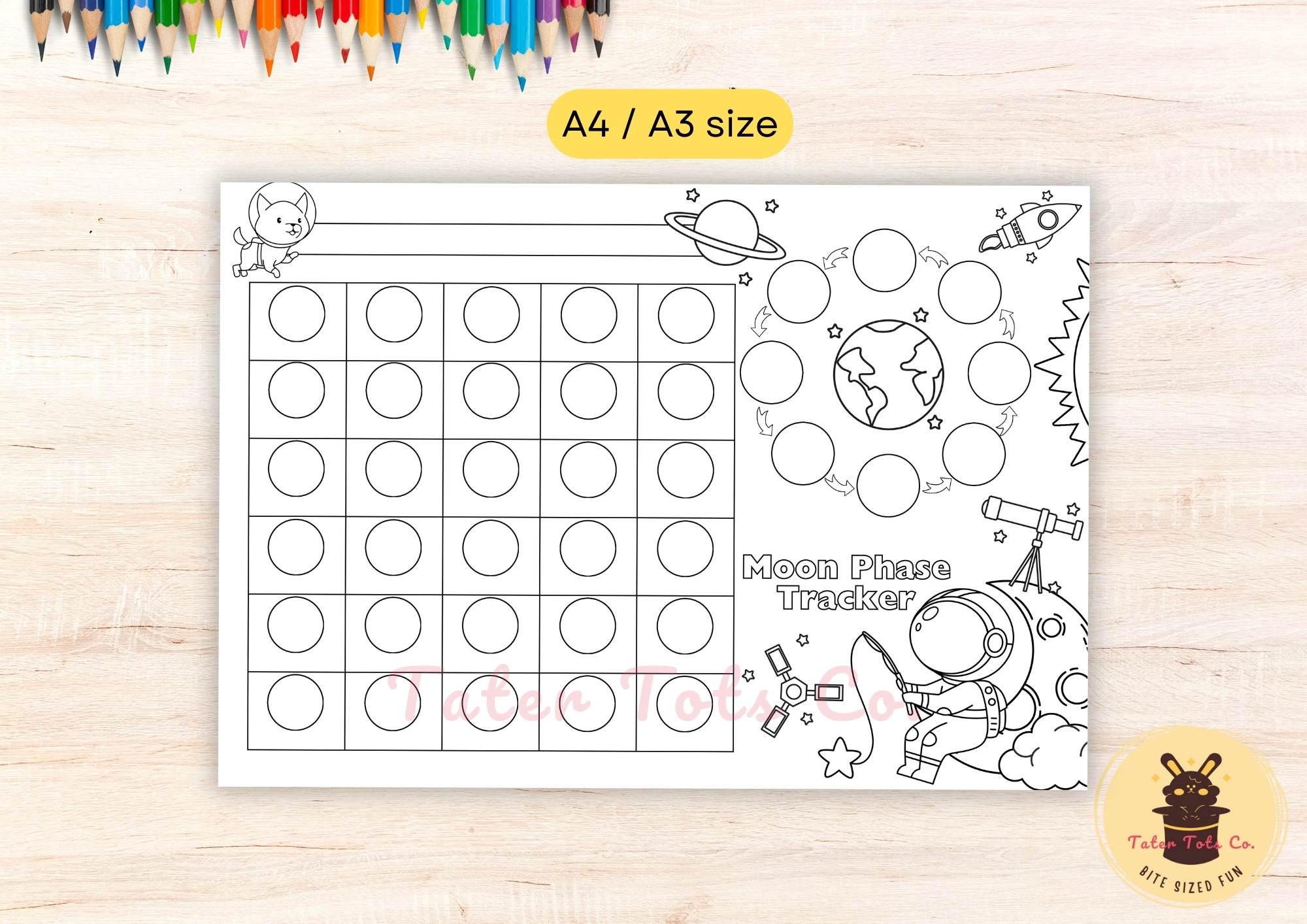 • Colorable Moon Phase Tracker for Kids up to A3 size (2 versions)