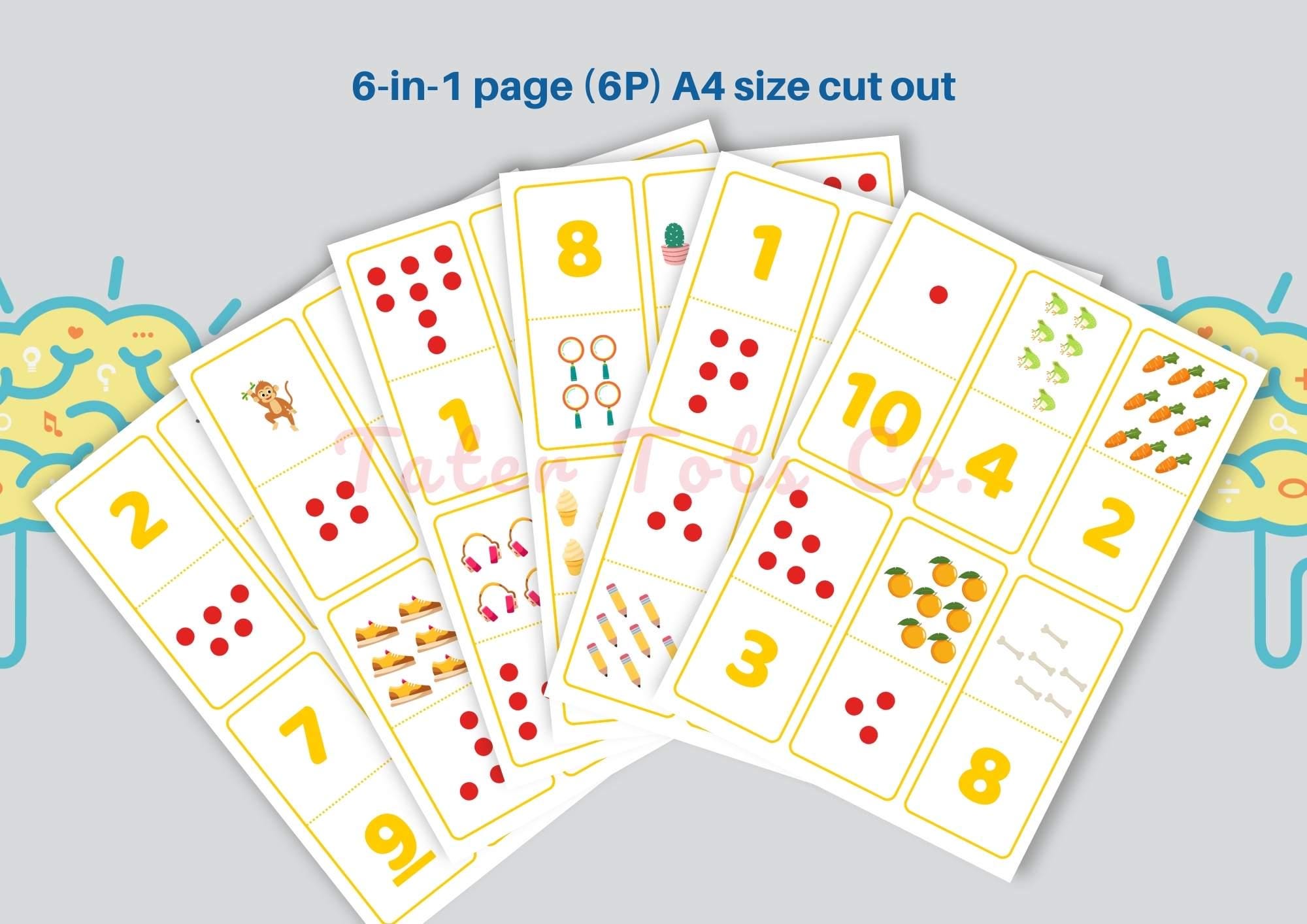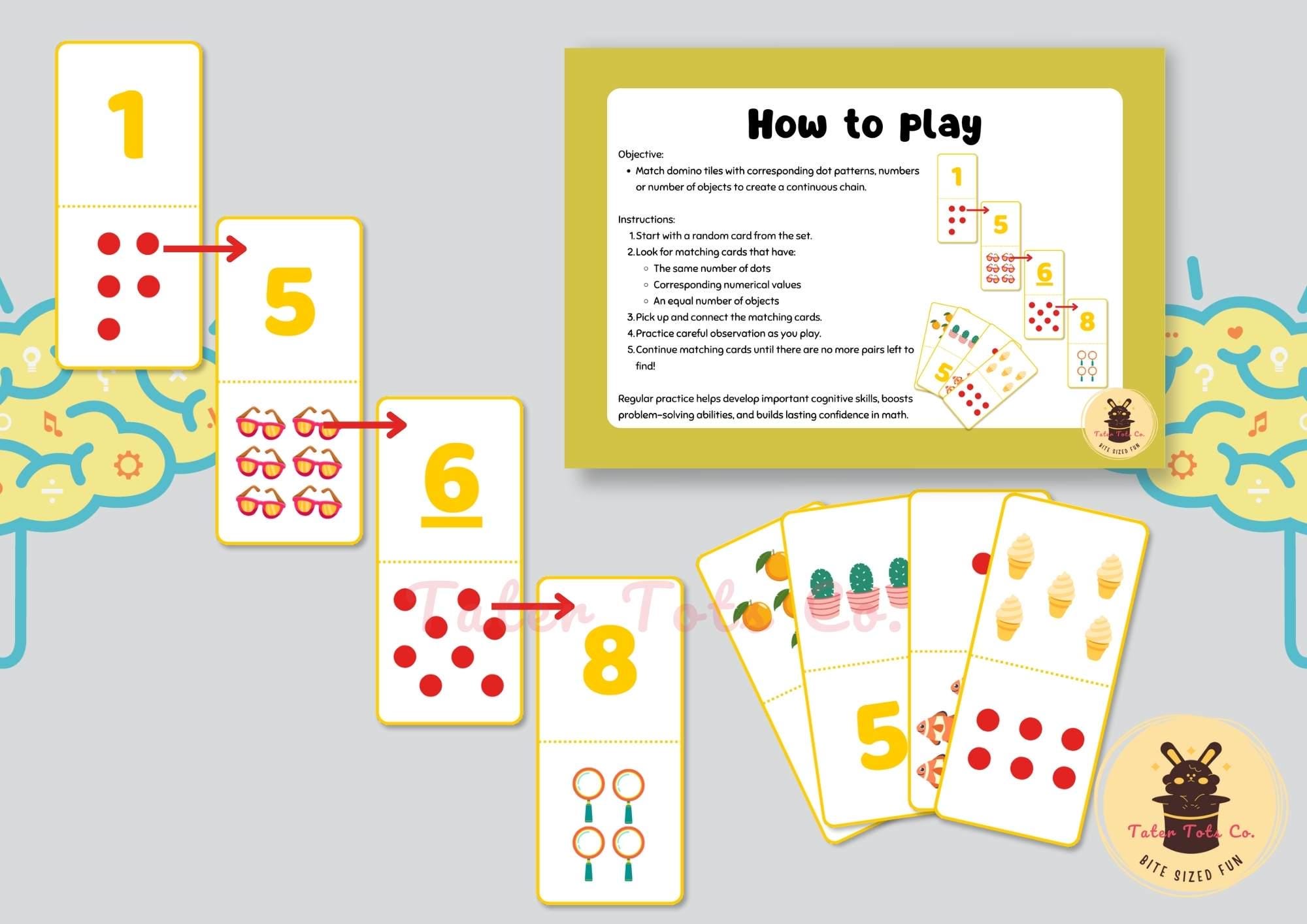 Discover the fun and educational benefits of our Number Domino Math Card Game (Intermediate Level). This engaging game is designed for young learners to enhance their early math skills through interactive play. Children can practice number recognition, one-to-one correspondence, and basic arithmetic operations with this stack of domino cards featuring numbers and dot patterns.