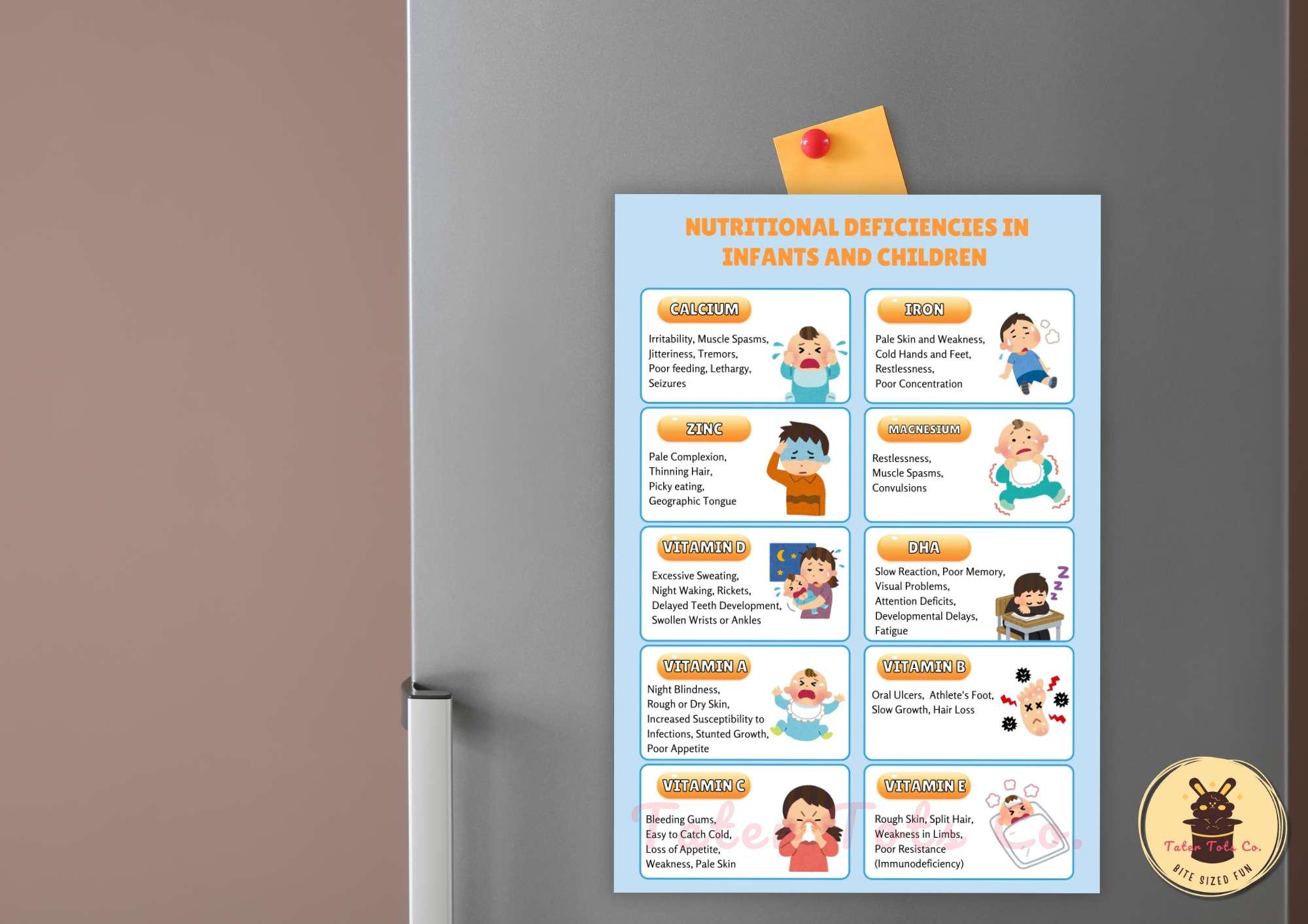 The simple infographic covers common deficiencies such as iron, vitamin D, calcium, and others, along with their symptoms and health implications. Learn how to identify signs of nutritional deficiencies, the importance of a balanced diet, and practical dietary tips to ensure your child receives the essential nutrients they need.