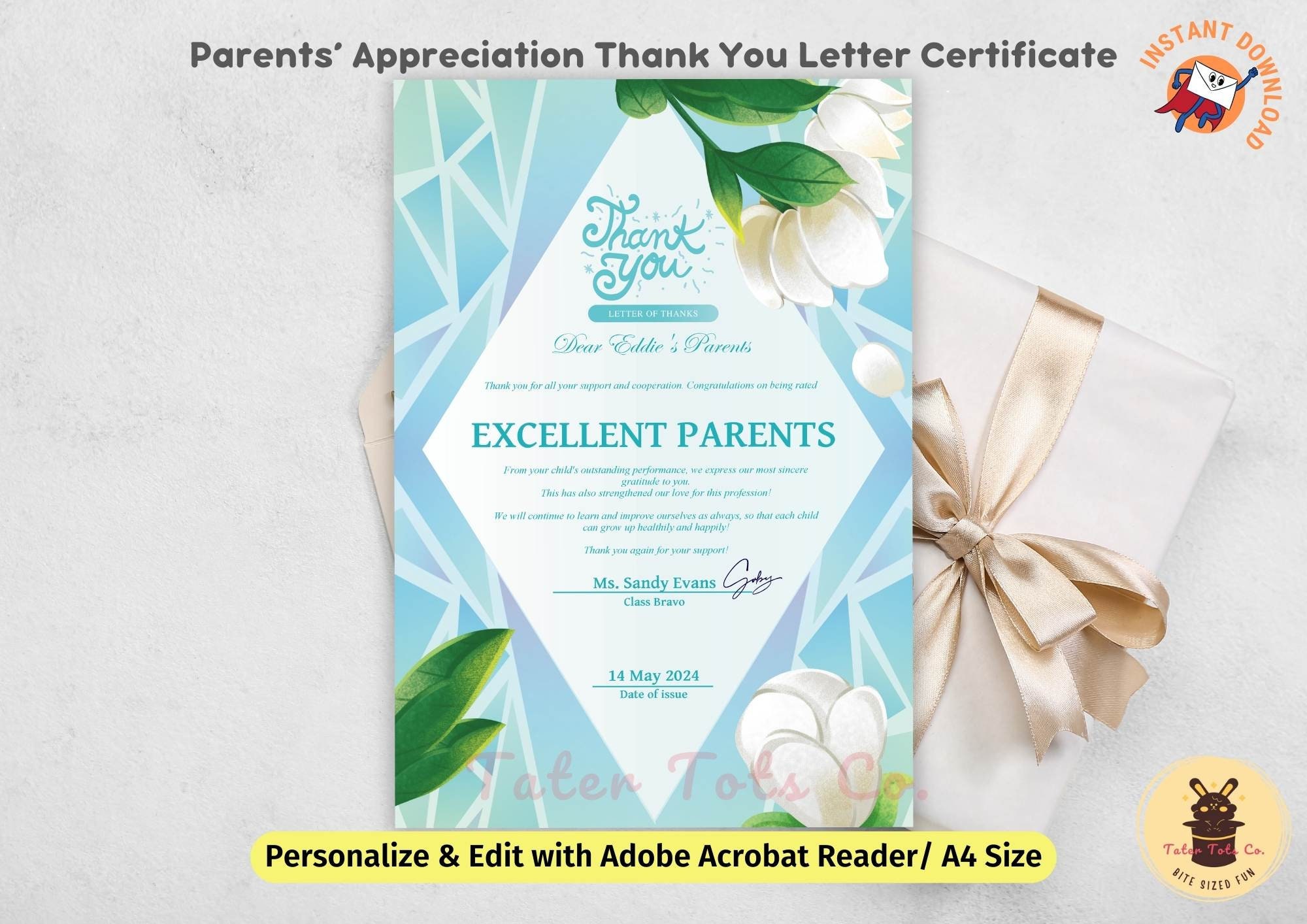• Editable Parents Appreciation Award Certificate Letter of Thanks A4 size